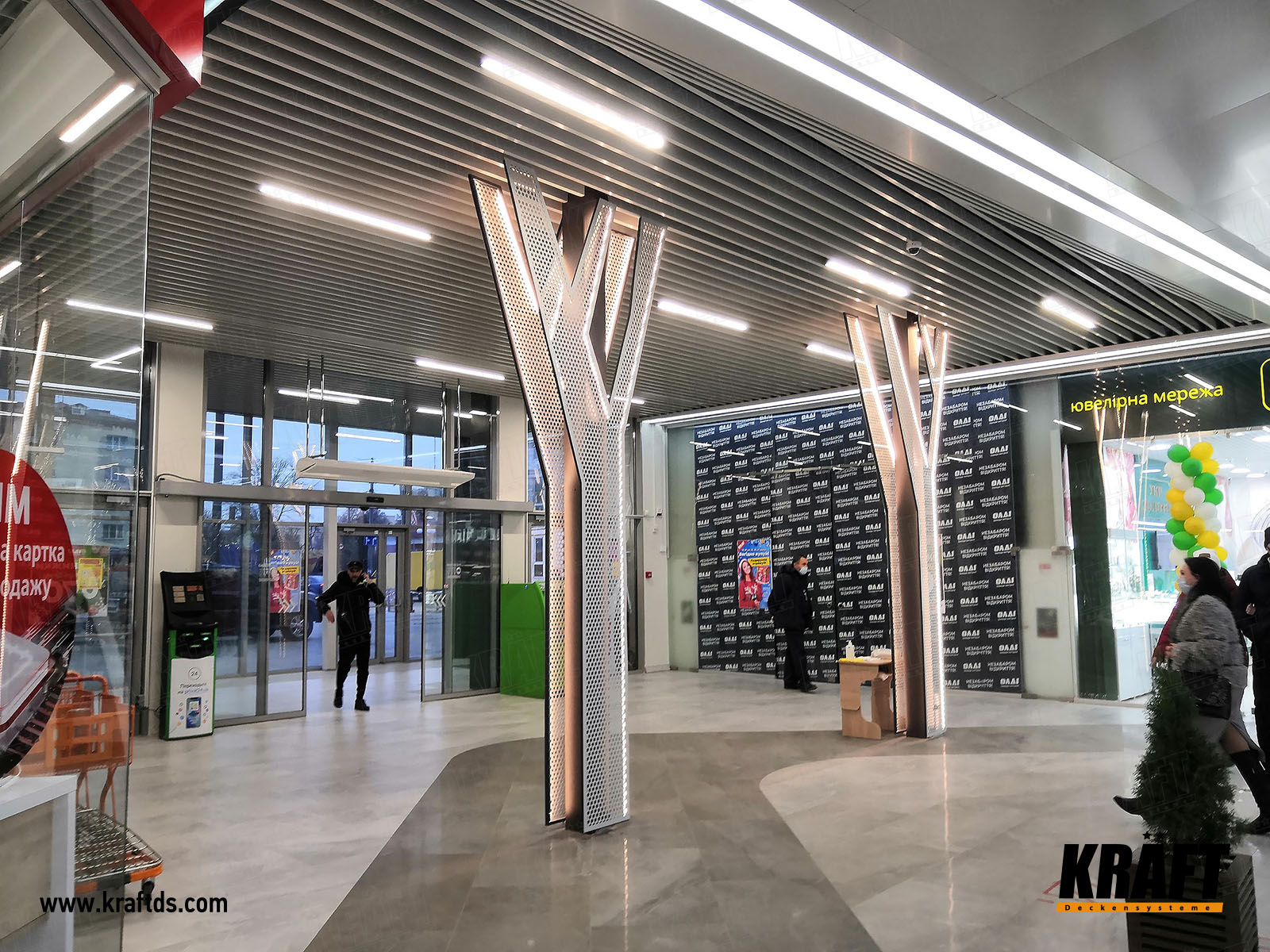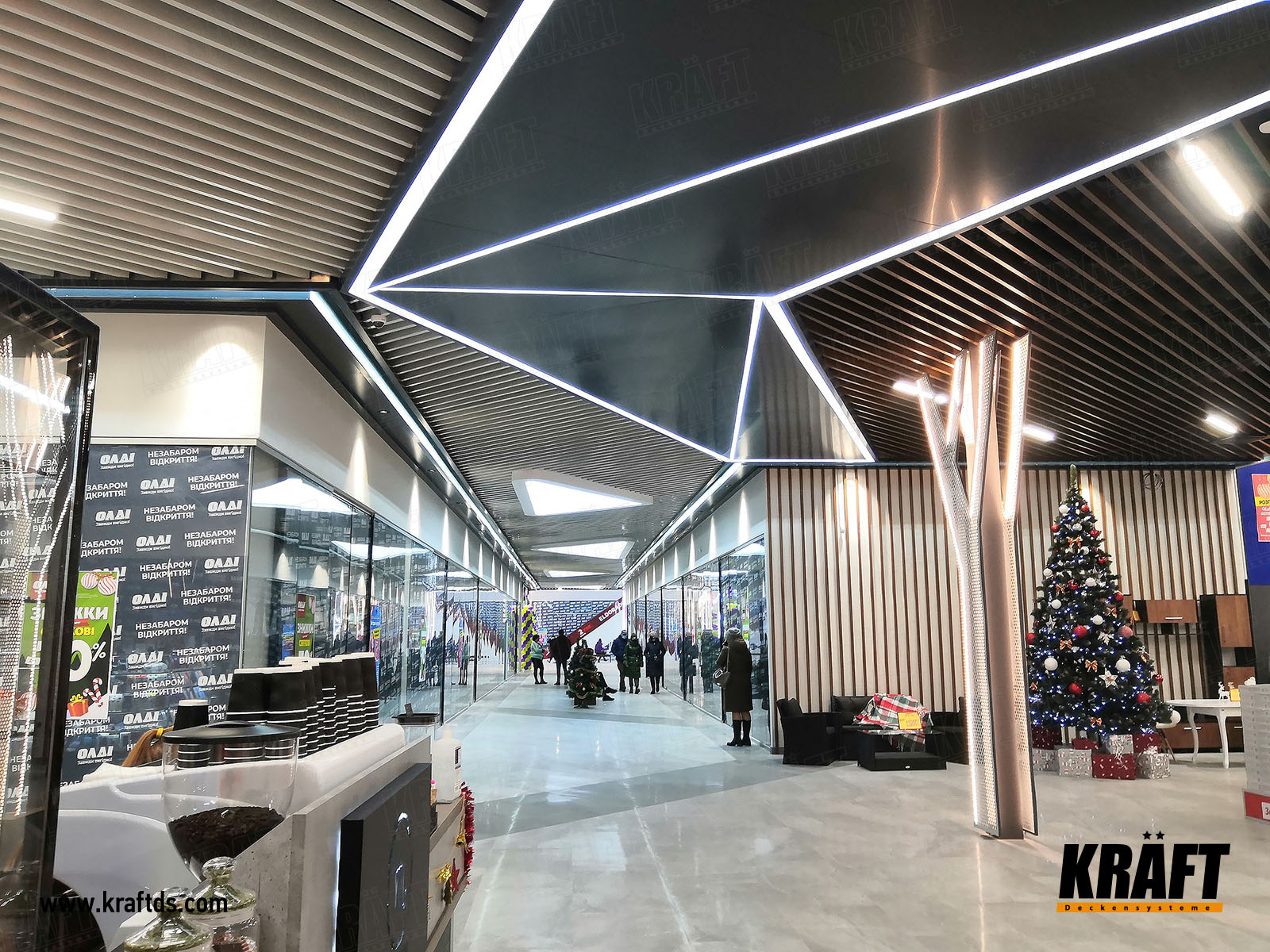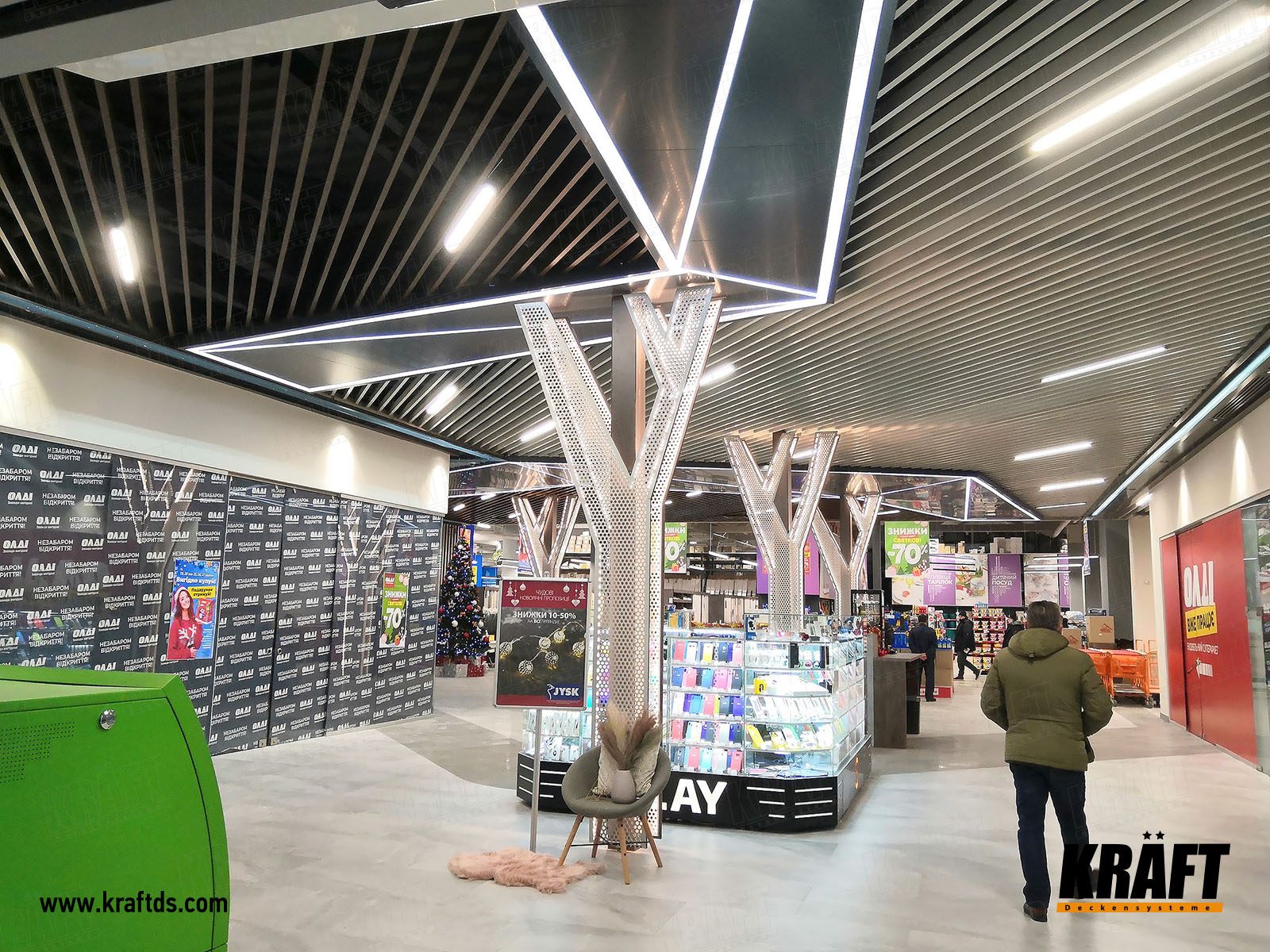Kolejny sklep sieci hipermarketów budowlanych OLDI został otwarty w Żytomierzu w październiku 2020 roku. Jednym z kluczowych elementów nowego, nowoczesnego wnętrza centrum handlowego był sufit. Generalnie sufit składa się z dwóch naprzemiennych układów - płyty stałej i sufitu podwieszanego z listew kubicznych KRAFT. Oryginalny projekt zawierał poszczególne elementy w postaci nieregularnych wielokątów oraz zastosowanie listew w dwóch różnych kolorach. Dzięki temu wnętrze zyskuje pewną asymetrię, która kontrastuje z monotonią jednolitego sufitu.