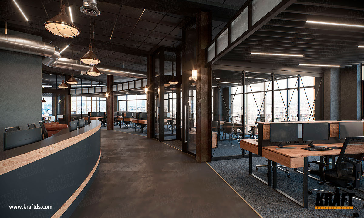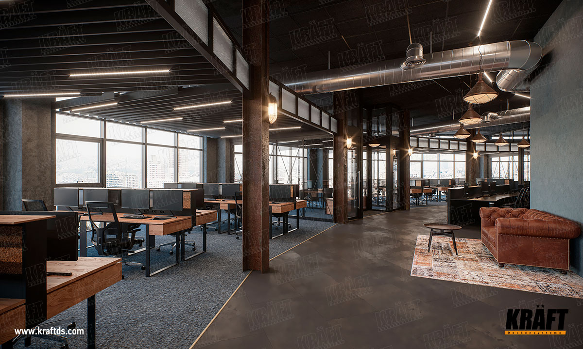 Pozostała część obszaru roboczego przeznaczona jest dla zwykłych pracowników wykonujących codzienną pracę wymagającą dbałości o szczegóły.  Dlatego zamontowano tutaj sufit ekranowy z listwy płaskiej KRAFT.  Sufit znajduje się na dość wygodnej wysokości od podłogi - około 3 metrów.  Taka wysokość sufitu nie pozwala człowiekowi zagłębiać się w „wysokie sprawy”, ale jednocześnie nie powoduje u niego poczucia opresji.