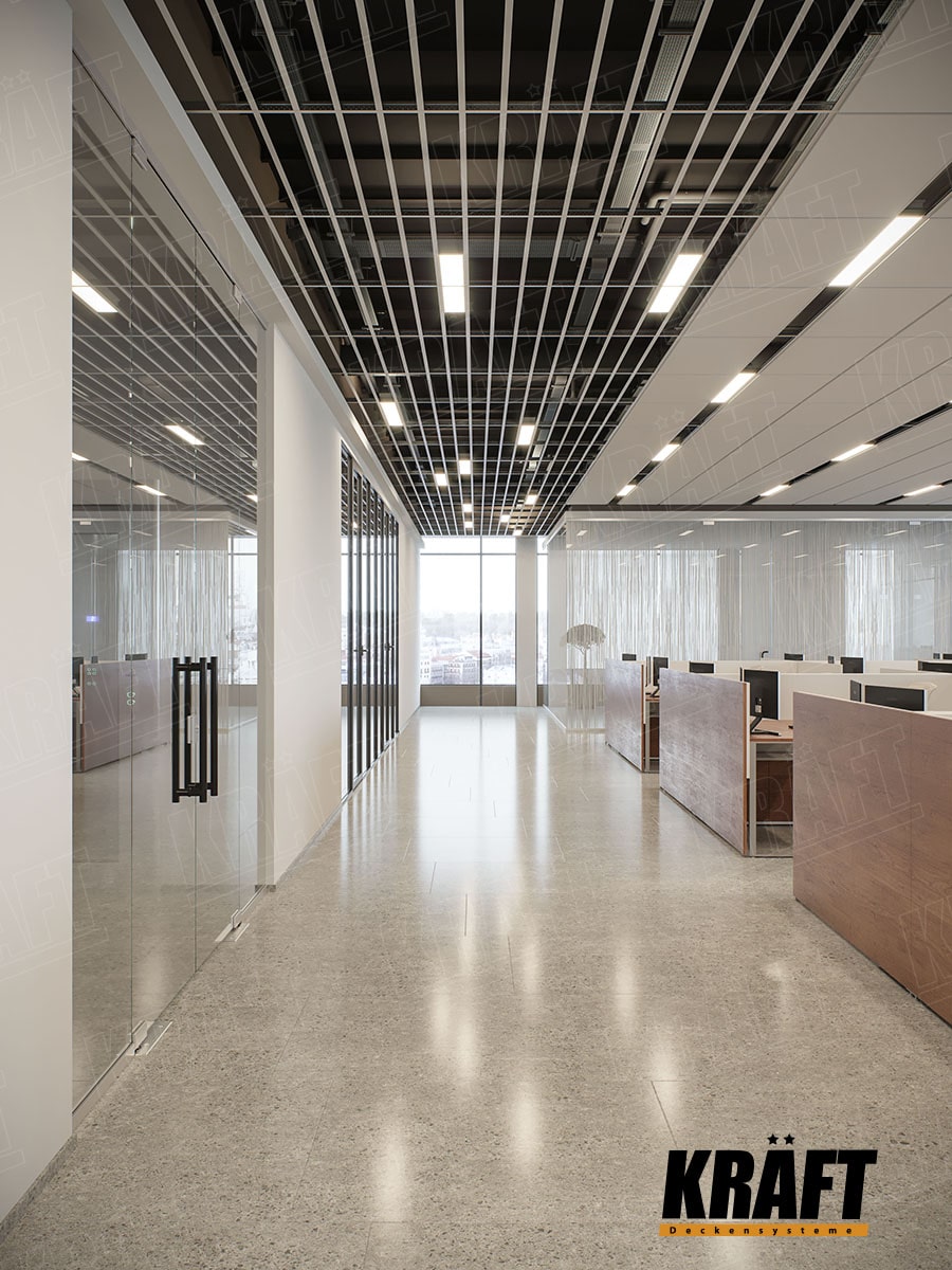Ale tylko się wydaje.  W razie potrzeby sufit podwieszany można wykonać z T-profilu, który będzie wyglądał stylowo i nowocześnie.  Na podłużnicach głównych (3600 mm) T-profili KRAFT co 150 mm rozmieszczone są zamki do poprzeczek.  Dlatego stosując prowadnice 1200 mm lub 600 mm można wykonać sufit, który wygląda jak skrzyżowanie sufitu rastrowego typu "żaluzje" i sufitu listwowego.