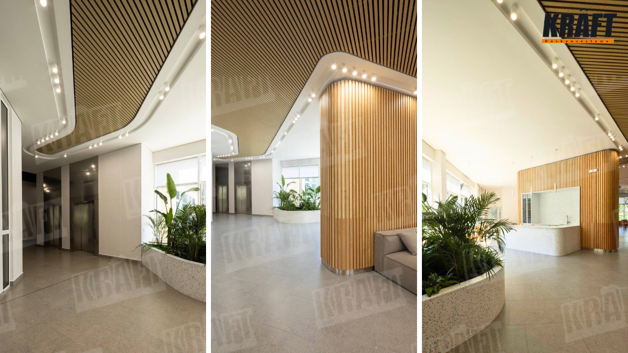 W ośrodkach rehabilitacyjnych otoczenie ma realny wpływ na samopoczucie pacjentów. Sufit lamelowy poprawia akustykę, zapewnia komfort wizualny oraz staje się częścią terapeutycznej atmosfery — wolnej od nadmiarowych bodźców, pełnej spokoju.