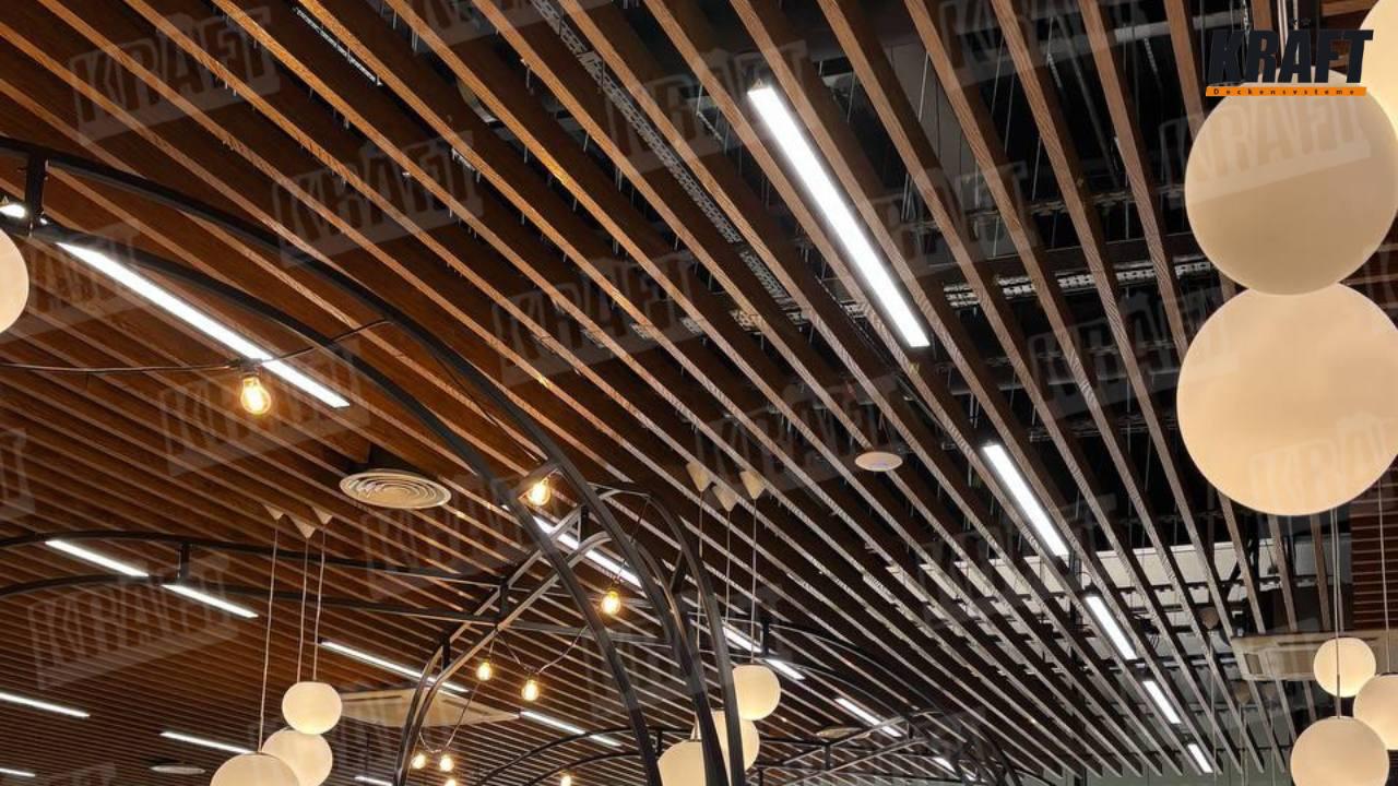 Sufit listwowy KRAFT o fakturze drewna: naturalna energia we wnętrzu restauracji