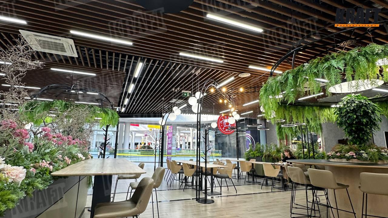 Restauracje to dziś nie tylko jedzenie. To atmosfera, komfort i estetyczna przyjemność. Kiedy gość wchodzi do lokalu, od razu zanurza się w przestrzeń, która buduje nastrój i nadaje rytm całemu doświadczeniu. Właśnie tak działa wnętrze restauracji w centrum handlowym Respublika Park, gdzie aranżacja zachwyca połączeniem nowoczesności i gościnności. Kluczowym akcentem projektu jest sufit podwieszany z listwy kubicznej KRAFT, wykonany w dwóch odcieniach — ciepłego drewna i klasycznej bieli (RAL 9003).