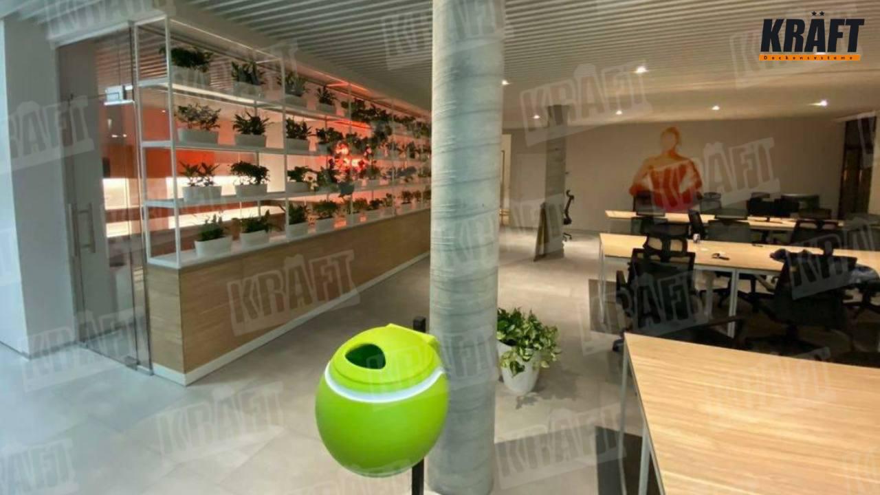 • harmonijnie współgra z meblami i szklanymi przegrodami, które dominują w układzie biura.