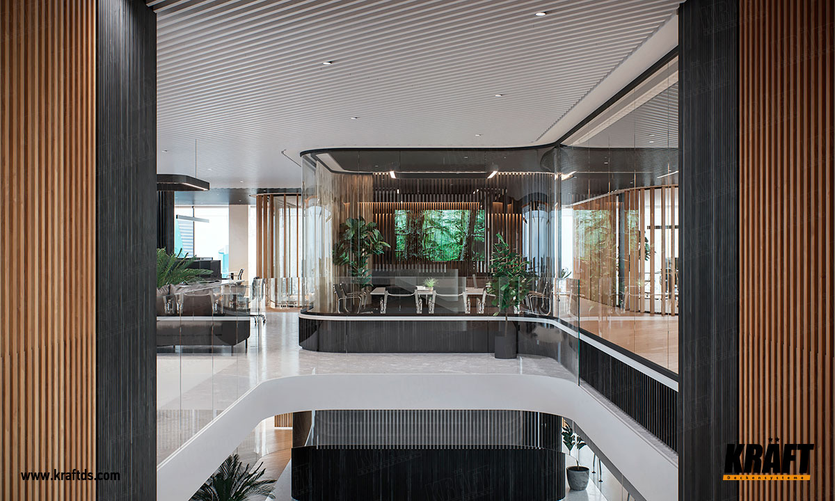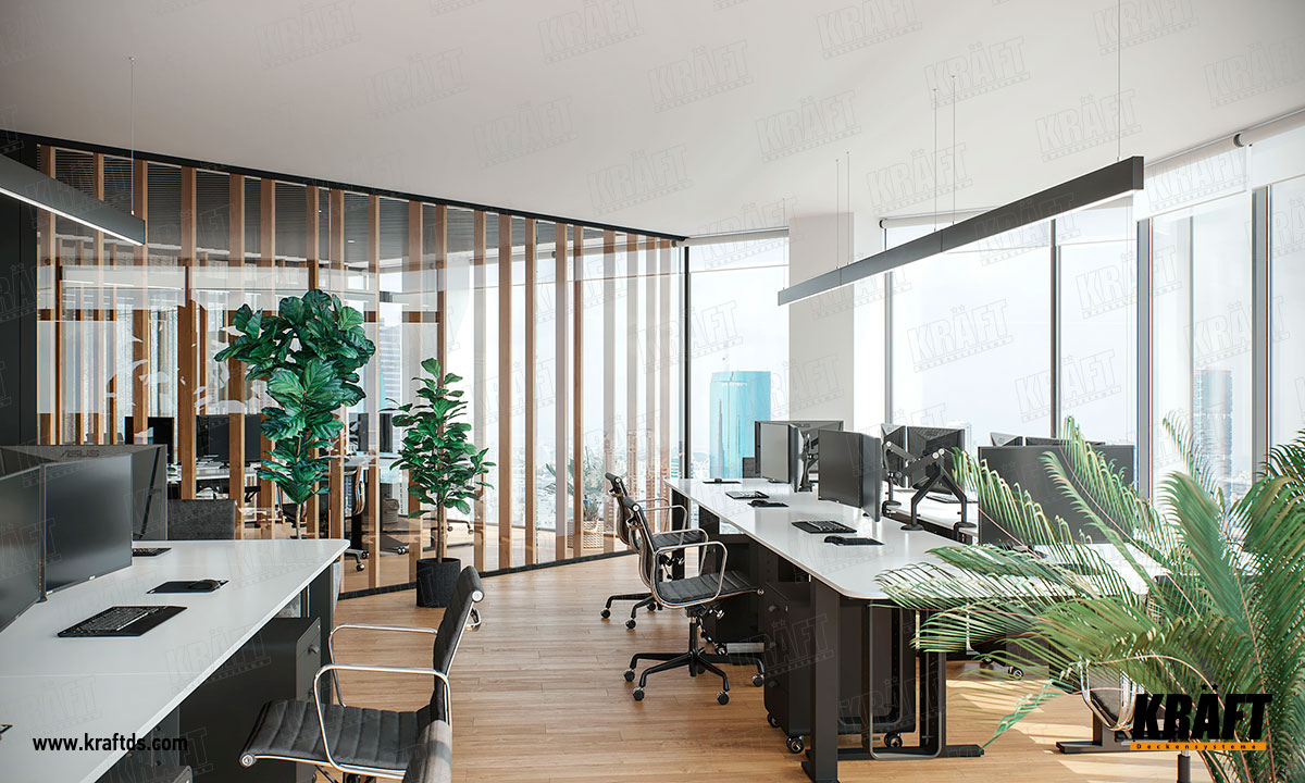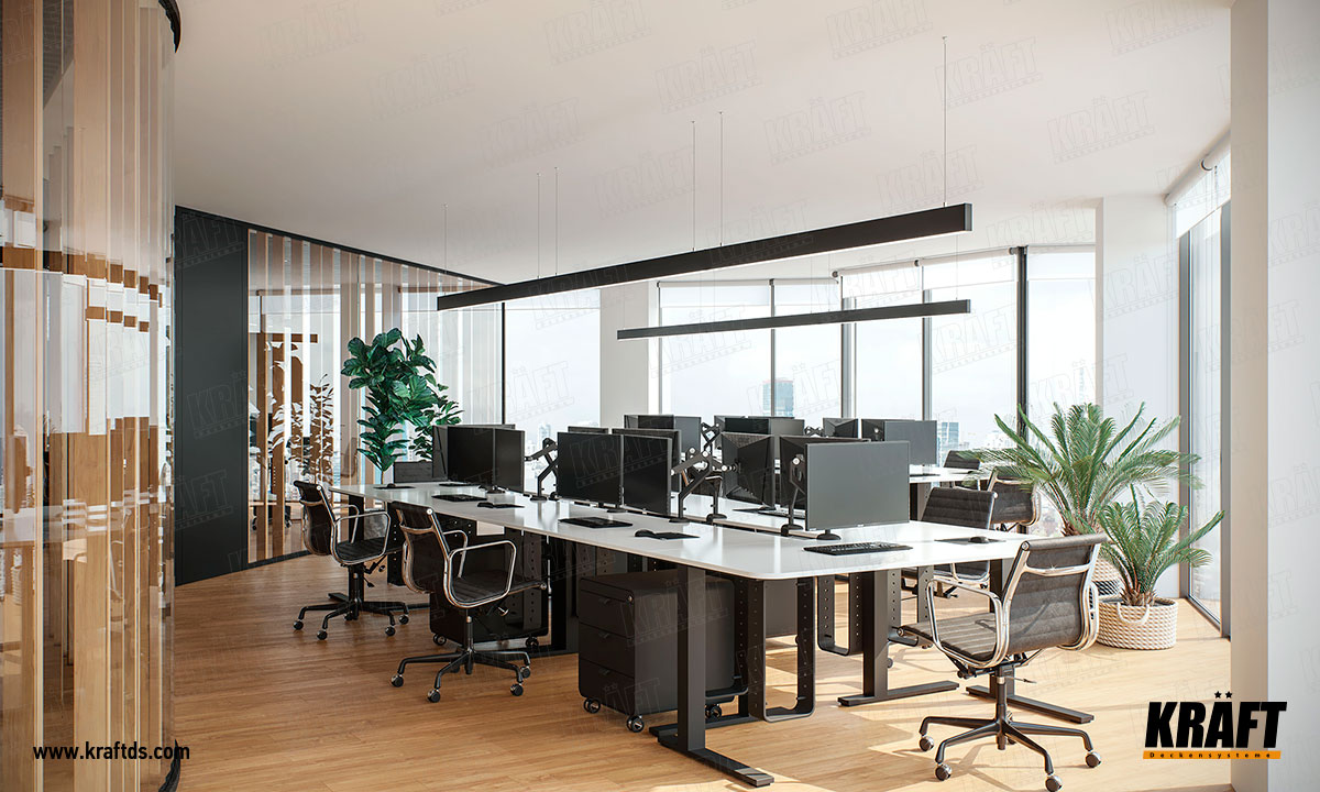 W niektórych obszarach biura jako oświetlenie zastosowano lampy KRAFT K-Led. Ten system oświetlenia nadaje się do wszystkich typów sufitów.  Są to pełnowartościowe oprawy oparte na listwie kubicznej 35x105 mm w dowolnym kolorze wg skali RAL lub fakturze drewna.  Sterownik znajduje się wewnątrz listwy. Długość uchwytów może wynosić 600 mm, 1200 mm, 2400 mm itp.
