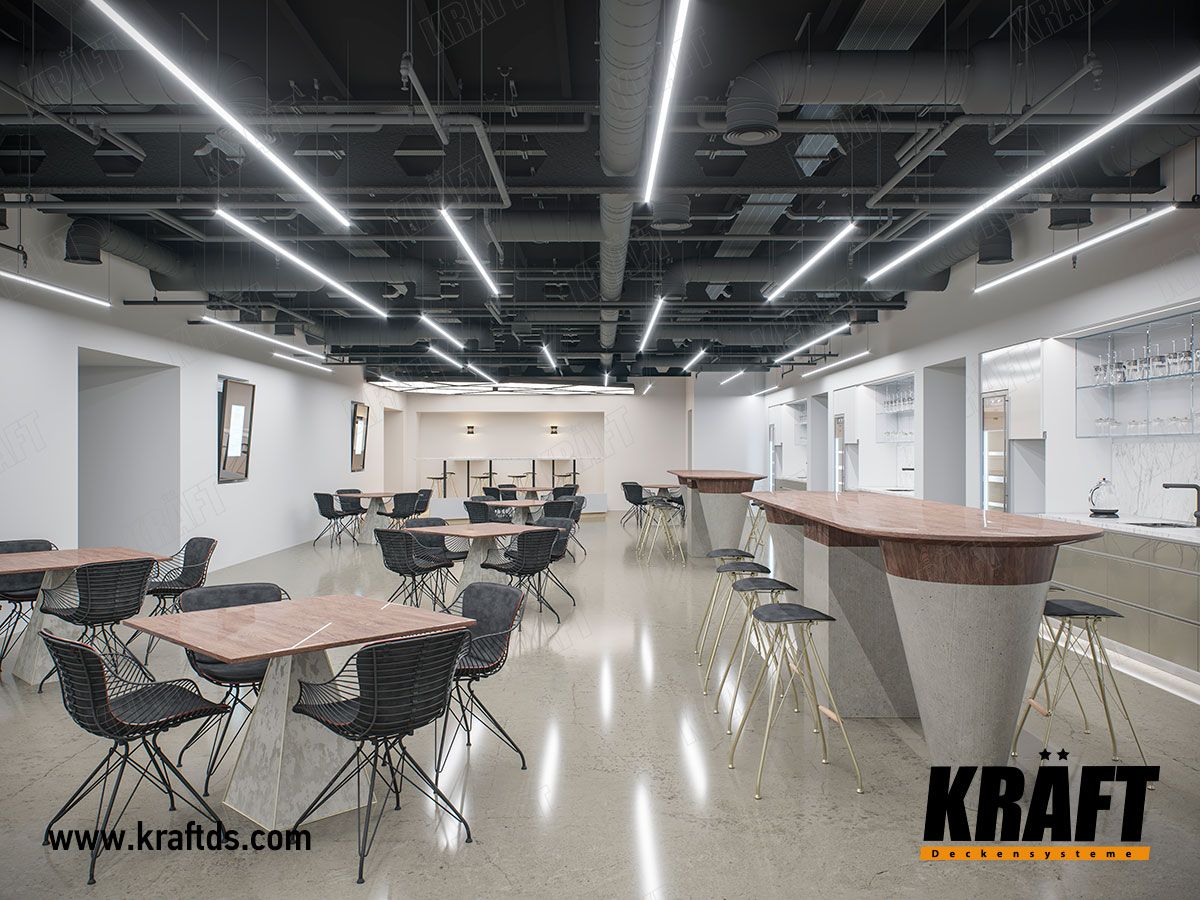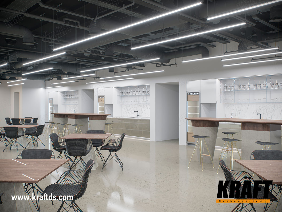 Przeplatanie się komunikacji na suficie najlepiej wpasowało się w ogólny styl wnętrza, dlatego zdecydowano się nie stosować sufitów podwieszanych, a ograniczyć się jedynie do oświetlenia.  Firma KRAFT opracowała serię opraw K-Led odpowiednich do wszystkich typów sufitów.  Ze względu na niewielką wagę można je nawet montować na własnych przewodach.  We wnętrzu tego pomieszczenia zastosowano lampy o długości 2,4 i 3,6 m. Poziom oświetlenia obliczono w programie Dialux, a ze względów projektowych lampy ułożono asymetrycznie, tworząc w ten sposób iluzję ruchu.  Efektem jest stylowe wnętrze z ekonomicznym systemem oświetlenia KRAFT Led.