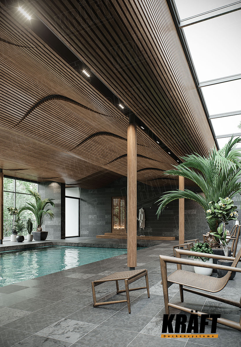 Jak widać na zdjęciach, projektanci postanowili wykonać sufity w strefie basenowej w kształcie fali. A żeby podkreślić fale w suficie, są one wykonane na różnych poziomach. Dzięki temu sufit podwieszany nie zlewa się w jedną przestrzeń, lecz wygląda bardziej trójwymiarowo. Zakończenie sufitu jest również zaokrąglone, na podobieństwo fali rozbijającej się o brzeg. Kolor listwy kubicznej również nie jest wybrany przypadkowo. Listwa z fakturą drewna doskonale komponuje się z otoczeniem, dodając mu delikatności i naturalności. Drewno zastosowano również w niektórych elementach wnętrza, dlatego podwieszany sufit wygląda bardzo efektownie. Ogólnie rzecz biorąc, rezultatem jest niezapomniane wnętrze, w którym wyraźnie widać zamysł projektowy.