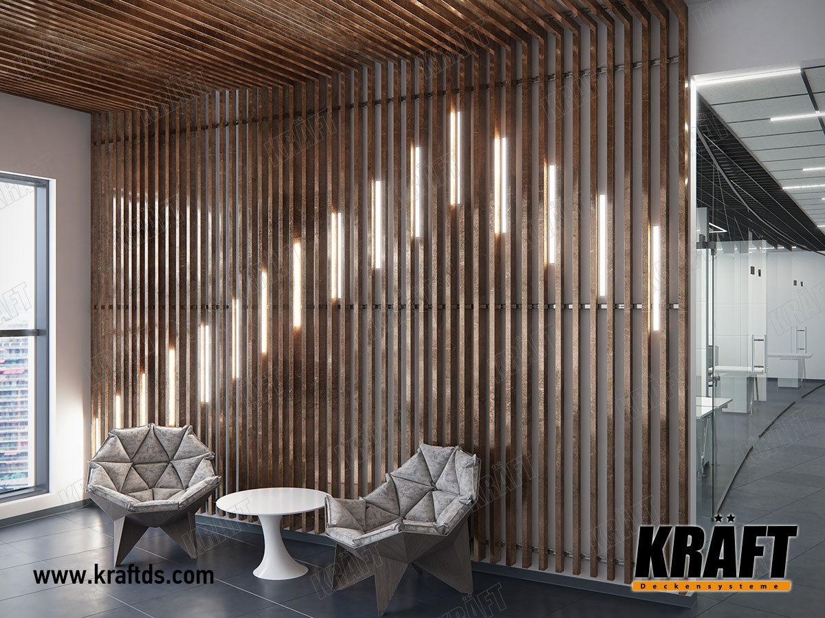 Stosując różne długości i odstępy między listwami, standardowa listwa kubiczna może zostać wykorzystana do stworzenia indywidualnego projektu sufitu w pomieszczeniu. A dla wsparcia wzoru sufitu można wykonać płynne przejście do ścian.