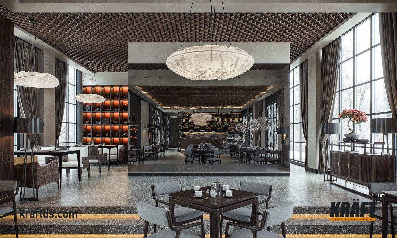 Na zdjęciu widać dwie sąsiadujące ze sobą sale restauracyjne o wspólnym stylu i wystroju. Jedyną różnicą między nimi jest podwieszany sufit. W pierwszym pomieszczeniu widzimy sufit listwowy wykonany z listew kubicznych o fakturze drewna. W drugim pomieszczeniu znajduje się sufit rastrowy o strukturze piramidalnej o tej samej fakturze drewna. Pomimo różnych rodzajów sufitów podwieszanych, oba pomieszczenia wyglądają stylowo i harmonijnie. O ile pomieszczenie z sufitem rastrowym nie posiada żadnych szczególnych cech, przyjrzymy się jednak bliżej pomieszczeniu z sufitem listwowym KRAFT, aby zrozumieć, jakie triki konstrukcyjne zastosowano przy projektowaniu sufitu podwieszanego.