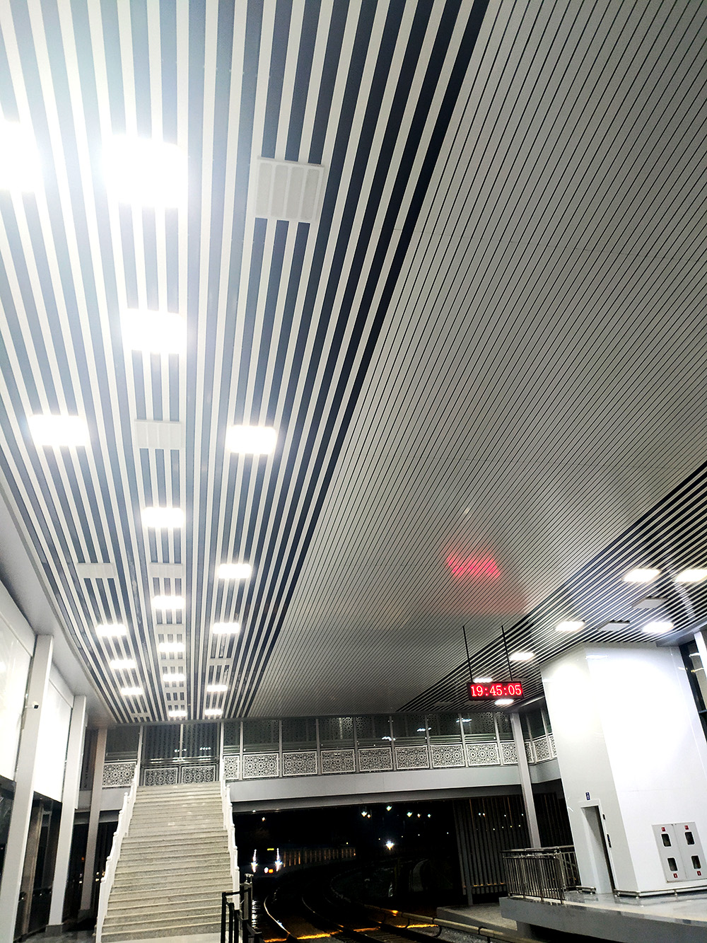 Sufit podwieszany na stacji wykonany jest z listew kubicznych 88x80mm firmy KRAFT. W obszarze centralnym, nad torami, rozstaw listew wynosi minimum 104mm. Nad platformą zamontowana jest listwa kubiczna o skoku 156mm.To połączenie odzwierciedla dolną część stacji, z bardziej zwartą strukturą nad kolejką i wolną przestrzenią nad pasażerami.