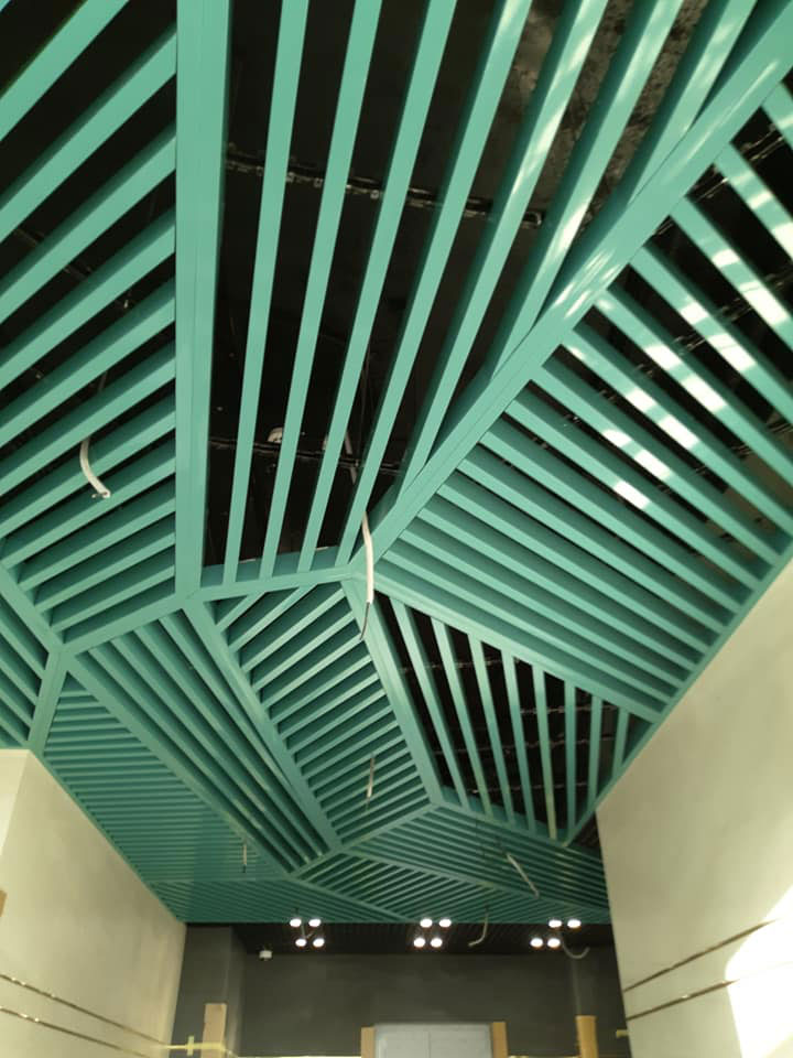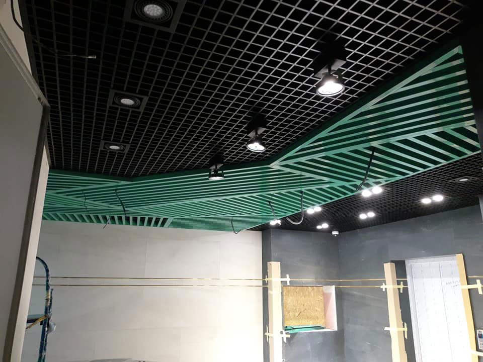 Installation of such a rack ceiling was not an easy task. First, imagine the layout of the ceiling: it was necessary to make a separate layout of the suspensions for each of the sections. Secondly, trim and install the traverse of the desired length and at the right angles. And thirdly, trimming each of the rails according to individual sizes and with a certain angle of contact. It was not easy!