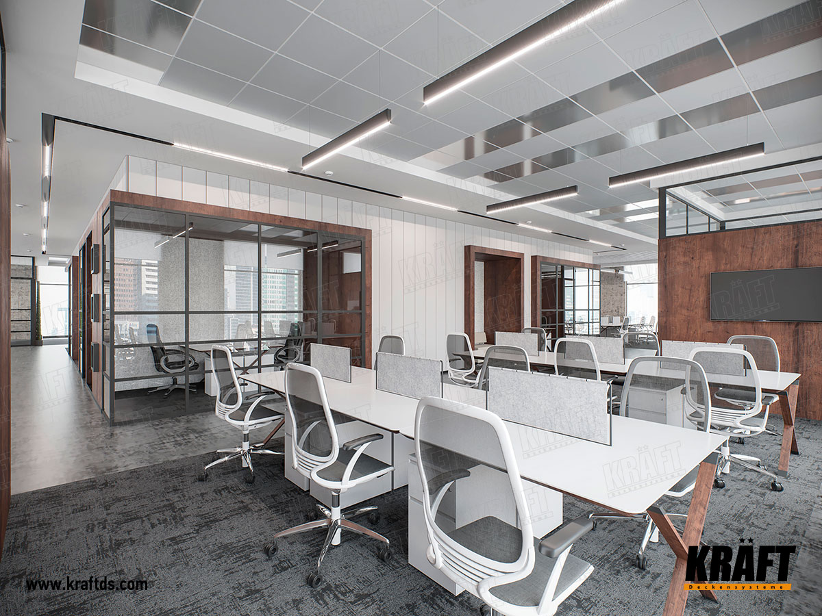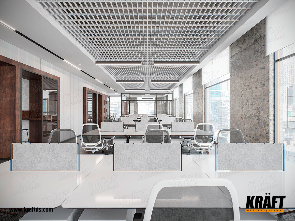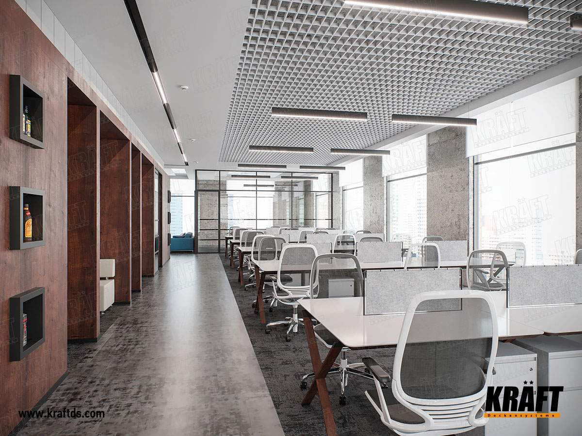 In the photo below, great ideas for designing suspended ceilings in the office. But why are metal plates on the T-profile and open cell ceiling grilyato “blinds” not very often seen in ceiling solutions? Let's figure it out.