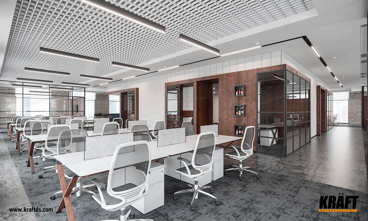 In the interior of this office, two types of non-standard false ceilings are used at once.