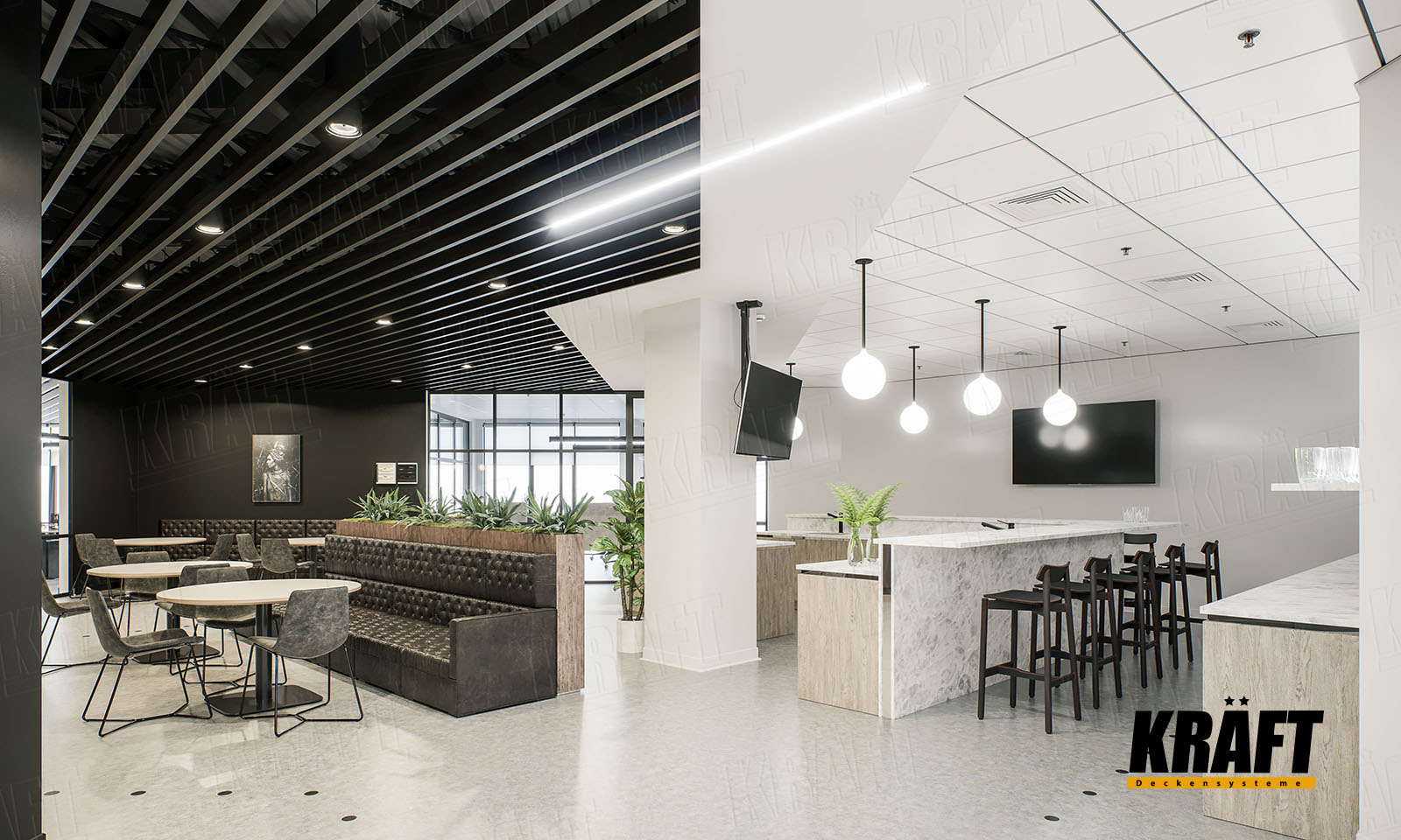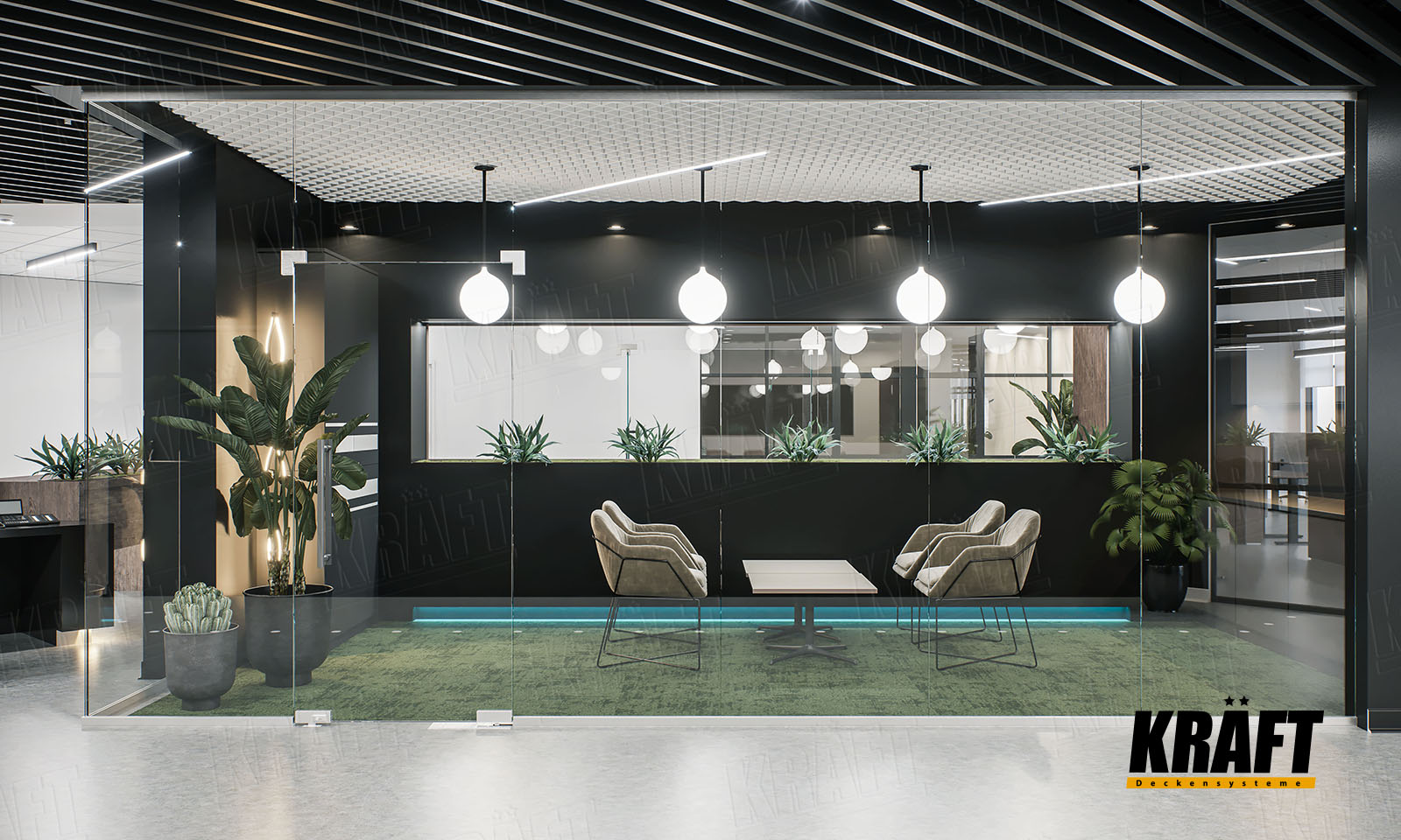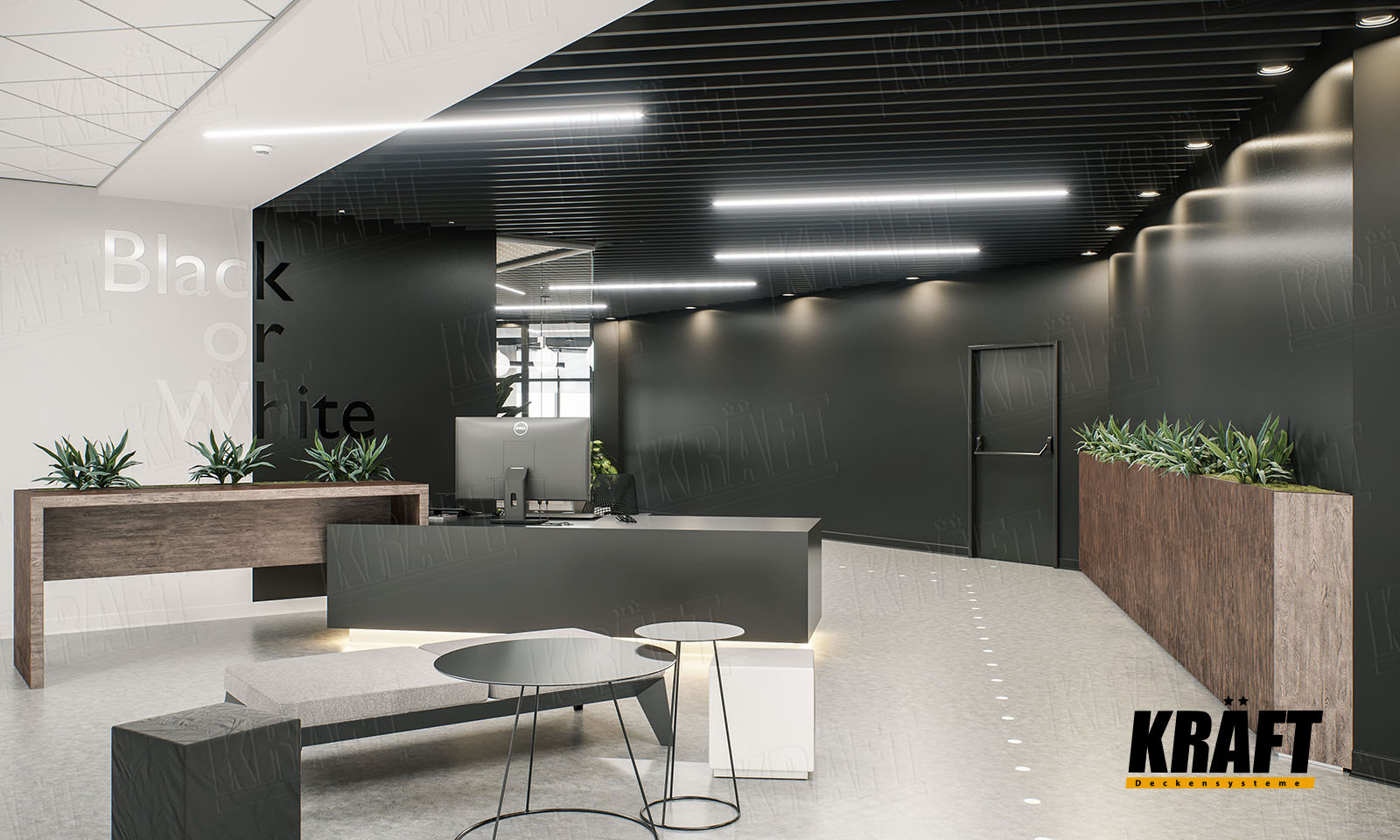 The interior of this office impresses not only with its contrasting black and white design, but also with the variety of KRAFT ceiling solutions - from cube-shaped rail and open cell ceiling to acoustic ceilings on T-grid system. The KRAFT Led lighting system and InterioLED luminaires harmoniously complete this unique composition. Let us immerse ourselves in a world of style and innovation.