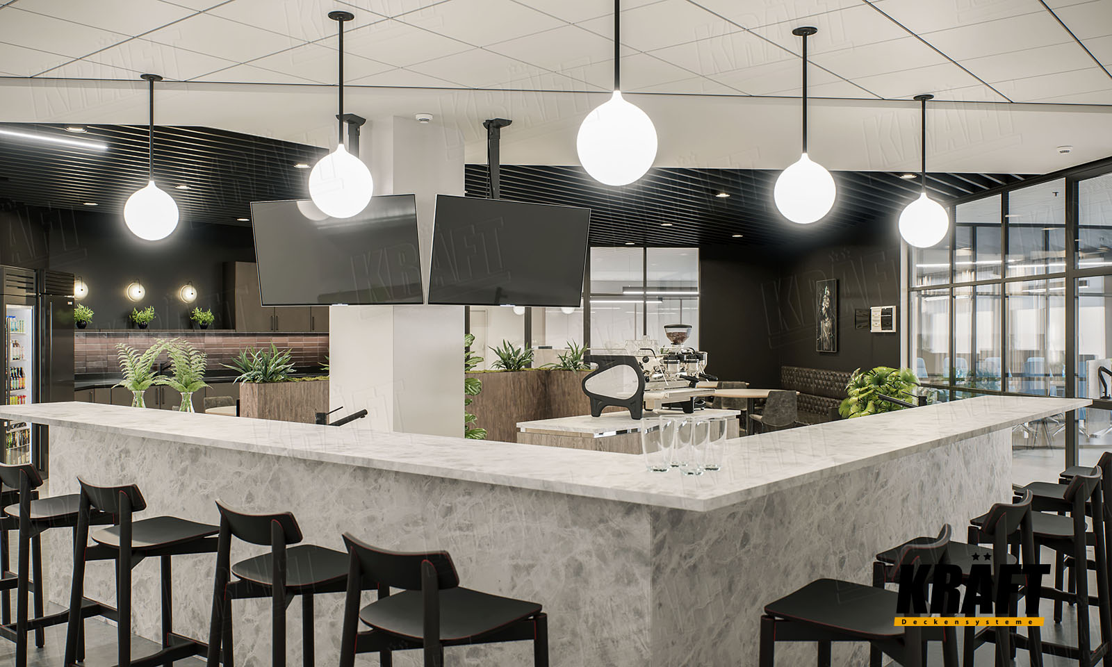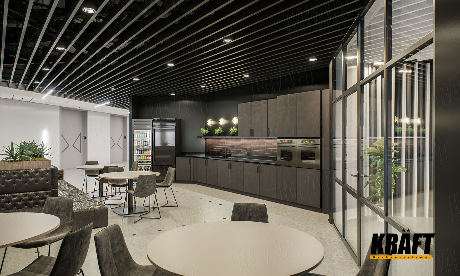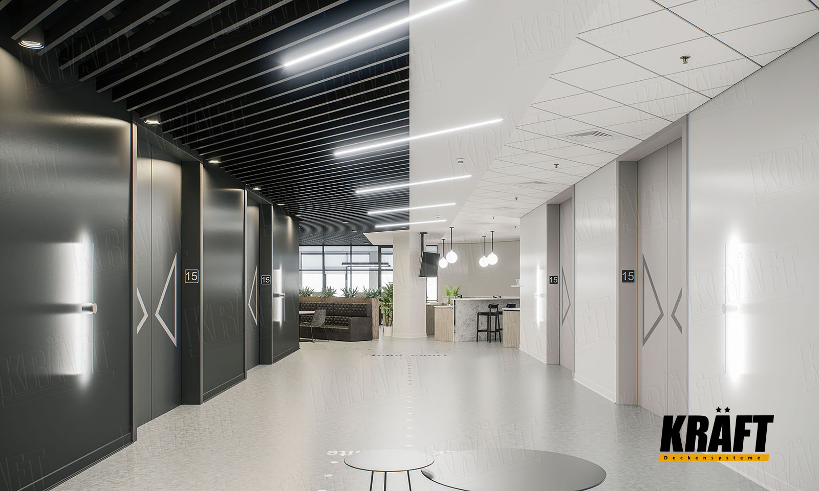 The interior of this office impresses not only with its contrasting black and white design, but also with the variety of KRAFT ceiling solutions - from cube-shaped rail and open cell ceiling to acoustic ceilings on T-grid system. The KRAFT Led lighting system and InterioLED luminaires harmoniously complete this unique composition. Let us immerse ourselves in a world of style and innovation.