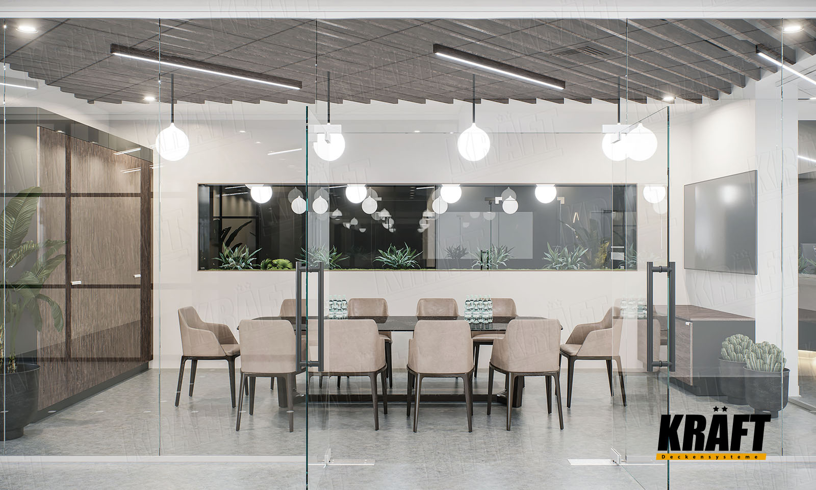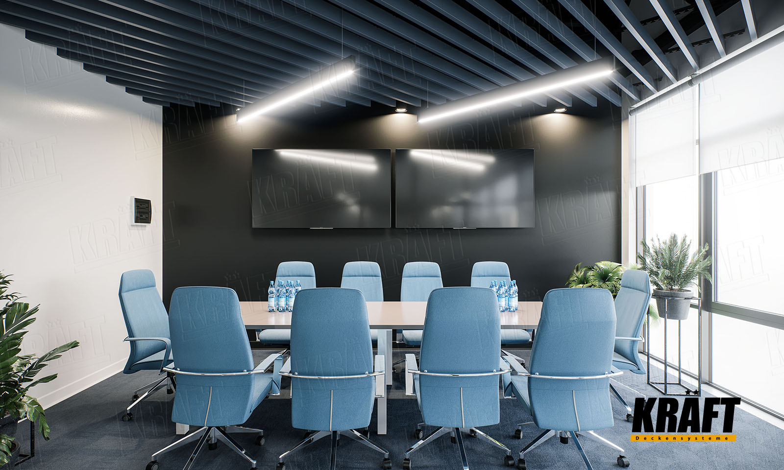 Open cell ceiling in the meeting room with KRAFT G-Led luminaires 1200 mm