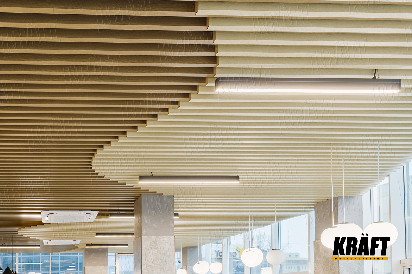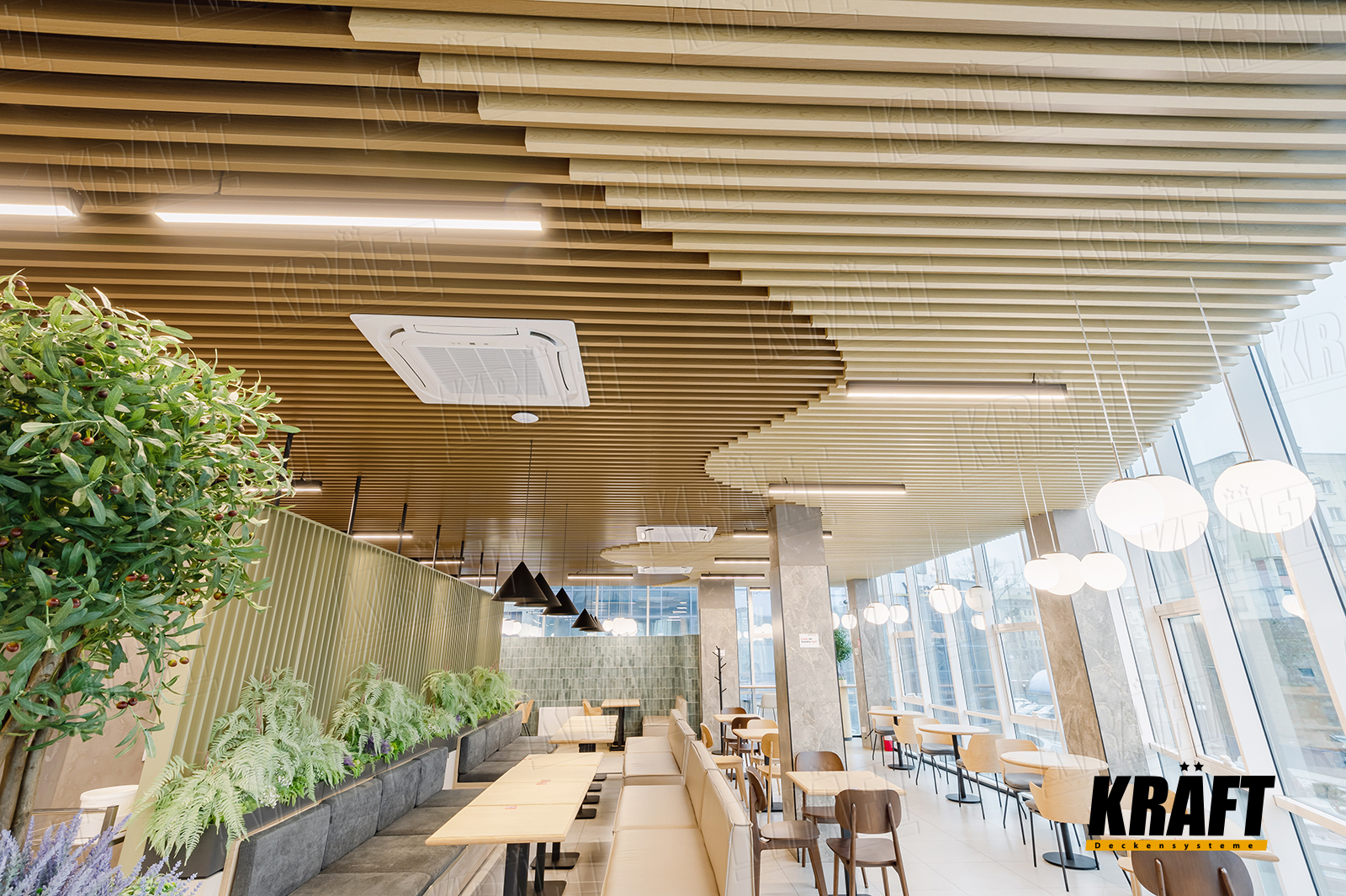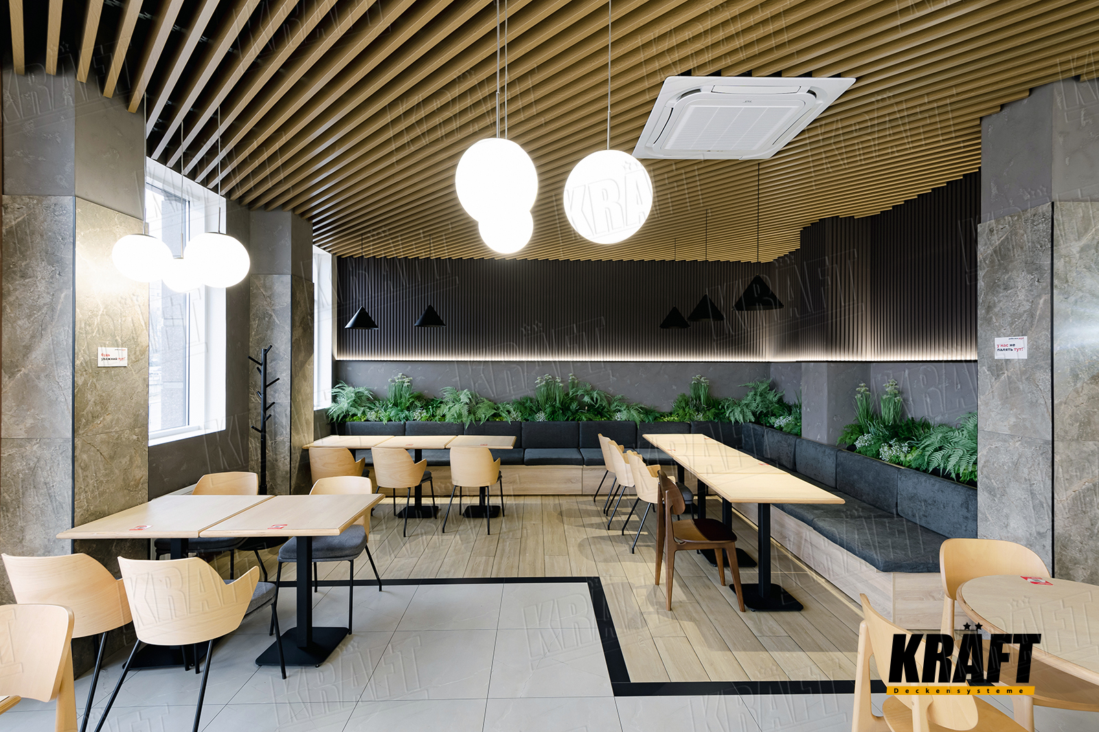 The interior of this restaurant combines stylish and practical solutions, and the key role in the design is played by a suspended ceiling made of KRAFT cube-shaped rail with wood texture. It harmonizes with the general style of the establishment, adding originality and comfort to the space.
