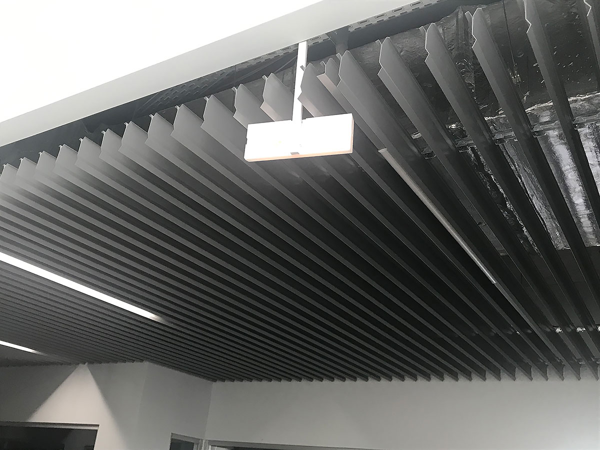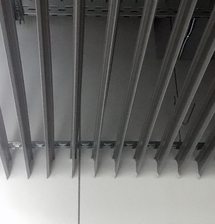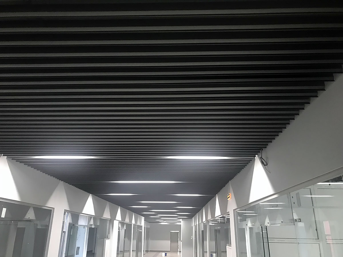 For the walkways and corridors of the mall, the KRAFT plate-shaped rail with a height of 100 mm and a pitch of 104 mm in black with an angled bend of the end was chosen as the ceiling. The bend of the rail is designed to increase the overlapping area of ​​the ceiling and the ceiling itself and give it additional volume. As you can see in the photo, in the general array the rail looks uniform and perfectly overlaps the communications under the ceiling. Installation and dismantling of the rack ceiling is one of the most simple, therefore, access to communications is quite simple. In addition, such a ceiling does not interfere with the operation of smoke removal and fire extinguishing systems.