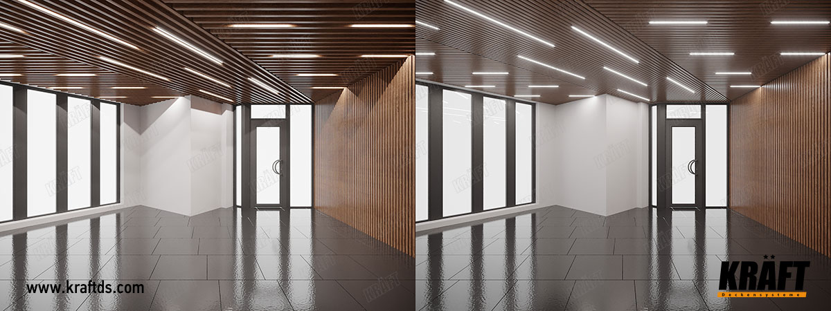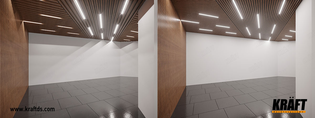 Two-tier ceiling made of KRAFT rail and open cell in the DAN store
