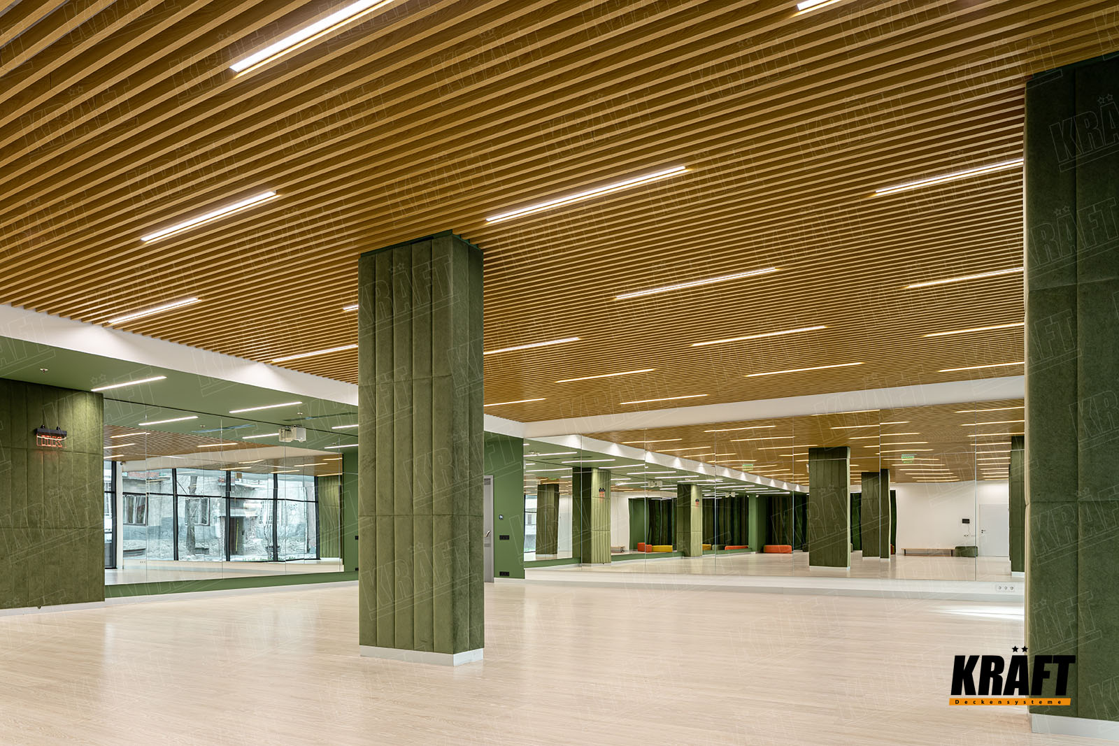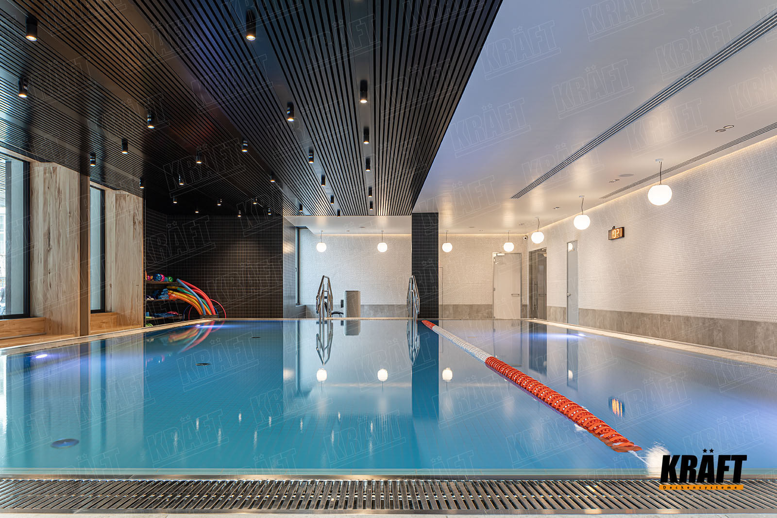 Sufity podwieszane KRAFT zastosowano nie tylko w pomieszczeniach ogólnodostępnych i salach treningowych, ale także na terenie basenu fitness klubu. Ocynkowana stal i powłoka polimerowa zastosowana w listwie kubicznej i sufitach rastrowych KRAFT umożliwia zastosowanie sufitów podwieszanych KRAFT w pomieszczeniach o wysokiej wilgotności.