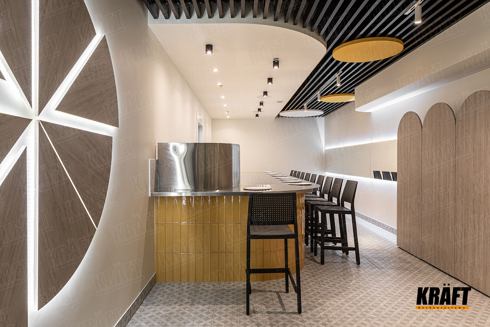 Kreatywnie zaprojektowany sufit podwieszany w sali restauracyjnej jako świadectwo szerokiego zastosowania sufitów listwowych KRAFT.