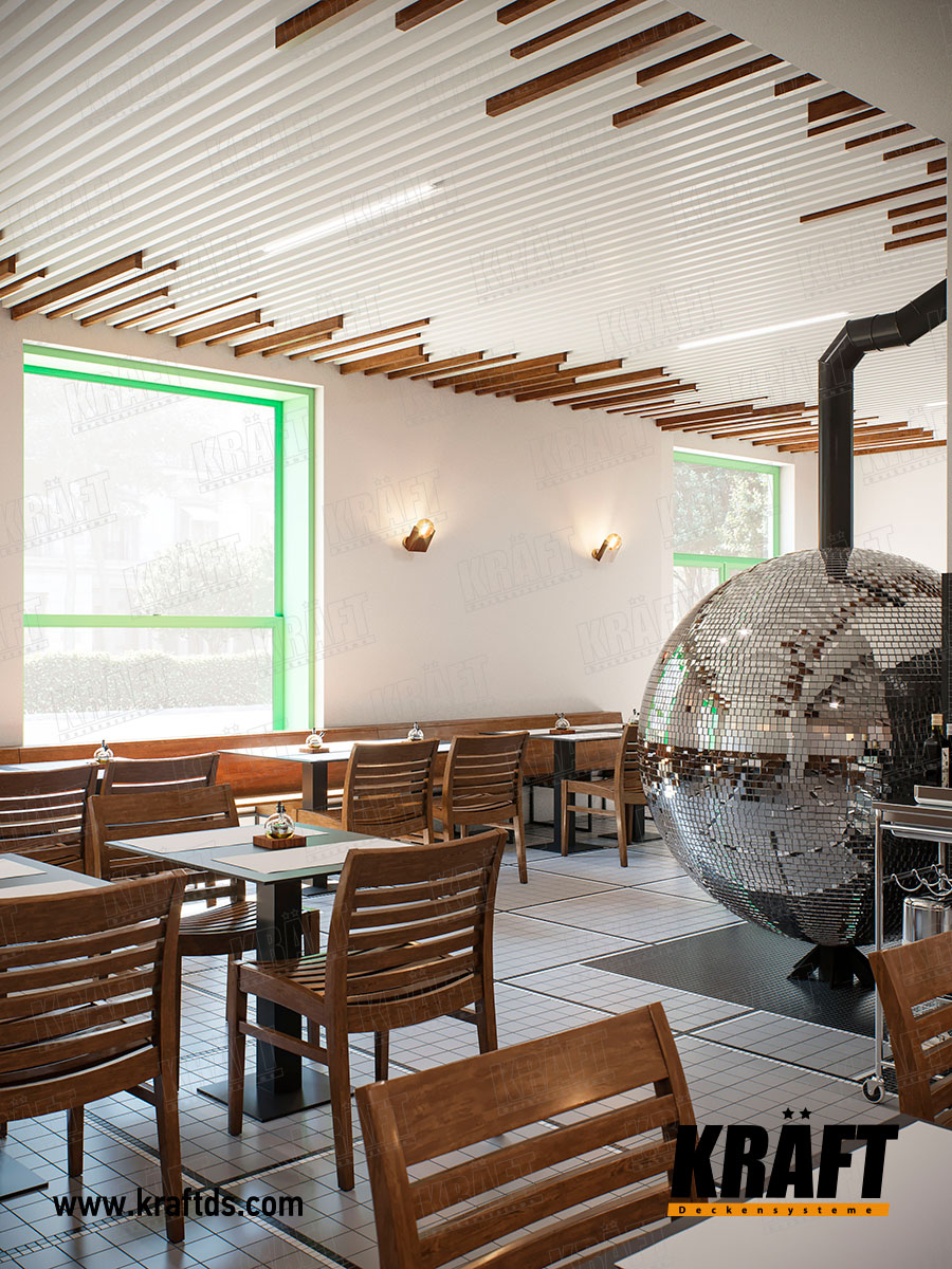 Bez wątpienia najbardziej rzucającym się w oczy elementem wystroju jest piec z kulami dyskotekowymi.  Ale dla takiego obiektu nie mniej ważne jest otaczające wnętrze.  Pomieszczenia pizzerii utrzymane są w tonacji bieli, a aby uniknąć skojarzeń ze szpitalem, projektantka zdecydowała się na „rozrzedzenie” sterylności – na podłodze drewniane krzesła, a na suficie wstawki z listew o fakturze drewna.  W suficie podwieszanym zastosowano kubiczną listwę KRAFT o wymiarach 35x65 mm z rozstawem 104 mm.  Aby uzyskać pewną asymetrię między białą listwą, zainstalowano listwę o strukturze drewna o wymiarach 35x105 mm, która wystaje ponad ogólny poziom sufitu.  Dzięki temu listwa teksturowa jest widoczna na całej długości pomieszczenia, co dodaje całości.  Warto również zaznaczyć, że do oświetlenia zastosowano lampy KRAFT G-Led, umieszczone pomiędzy listwami głównymi.  Takie oprawy idealnie wpasowały się w to wnętrze – po wyłączeniu oprawy są praktycznie niewidoczne na białym suficie, dzięki czemu sufit lamelowy wygląda jak jeden szyk.