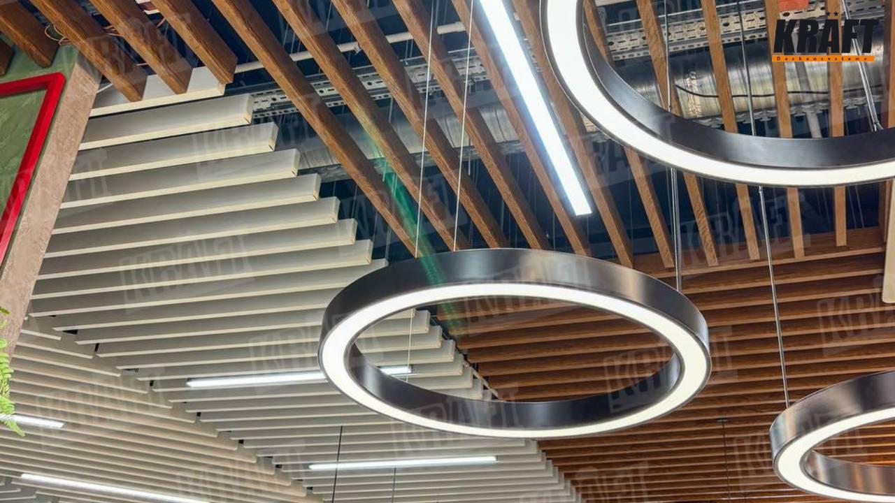 • Lepsza akustyka. W dużych salach poziom hałasu może być wysoki. Sufit z listew pomaga pochłaniać i rozpraszać dźwięki, tworząc komfortowe warunki do rozmów.