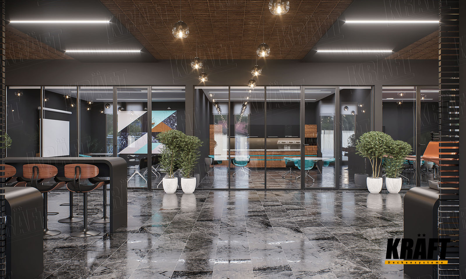 Koncepcja została opracowana przez zespół projektowy KRAFT jako demonstracja możliwości sufitów w aranżacji przestrzeni biznesowej.
