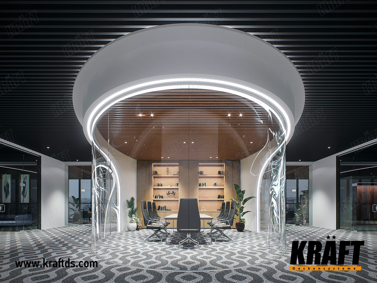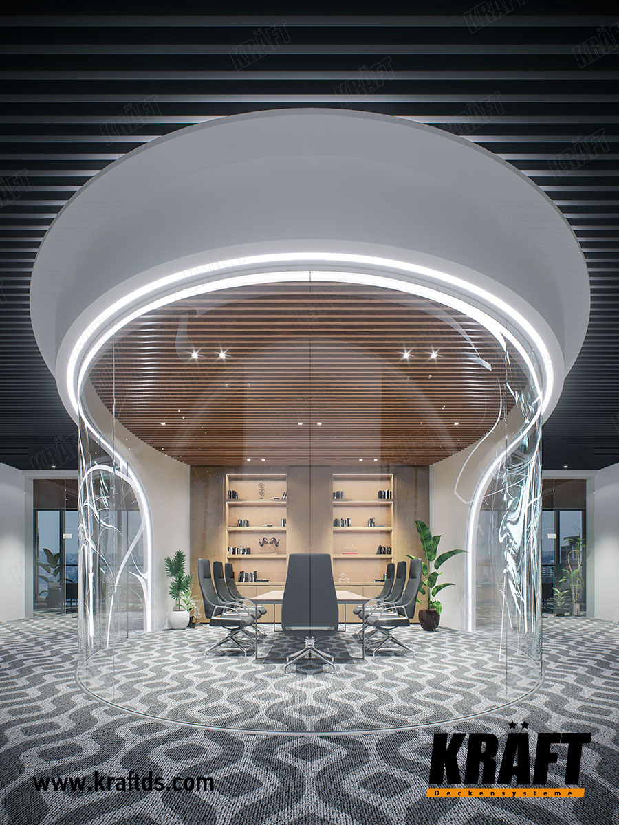 The designer managed to place the meeting room in the hall, at the same time without cluttering the room. Thanks to the rounded shape and minimalist design, the room does not look like an alien body, but smoothly fit into the interior. Nevertheless, you can see a clear zoning, including through the use of lath ceiling in different colors. The prevailing office design is strict and official, therefore the main ceiling is made of black slats. The meeting room looks like a kind of oasis thanks to the slatted ceiling in a warm shade "under the tree" and wooden furniture.
