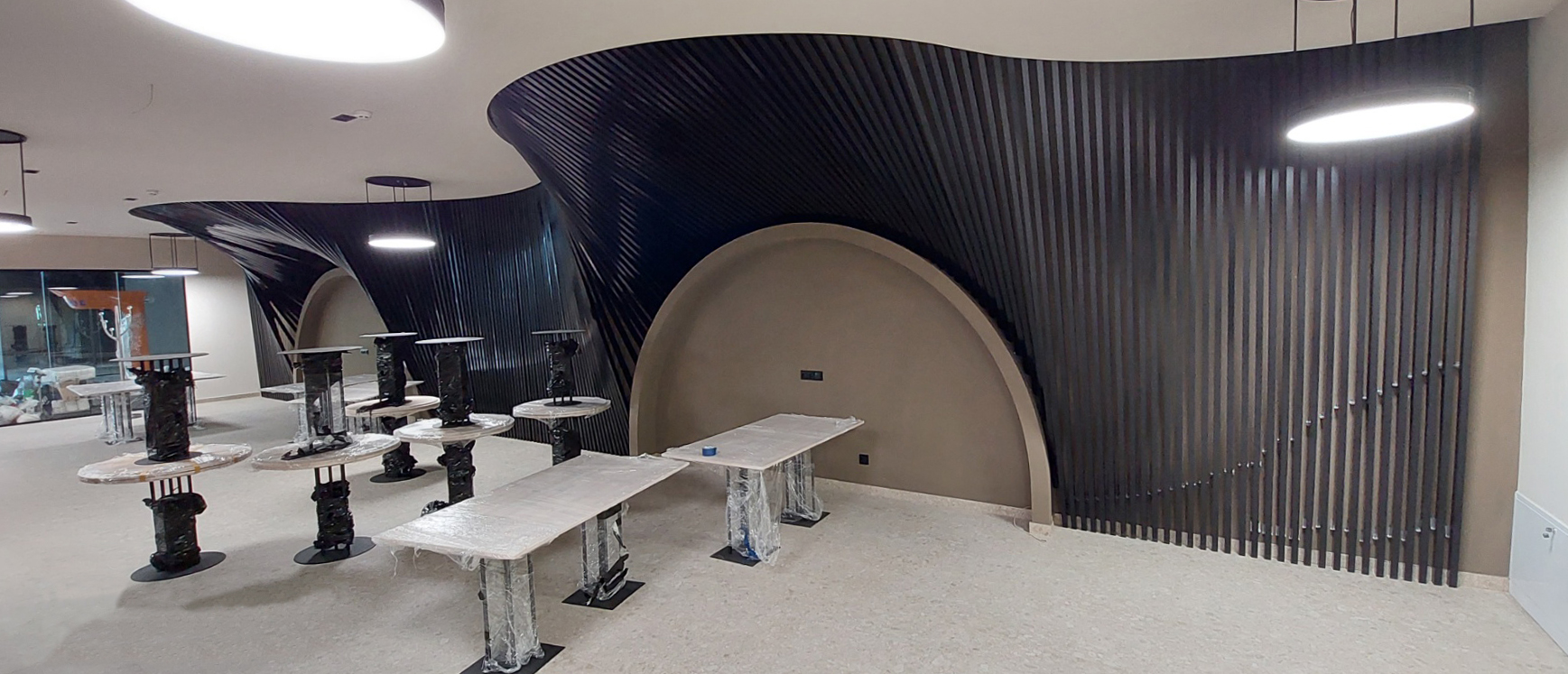To your attention - an example of the use of the KRAFT cube-shaped rail not only as a false ceiling, but also for decorative wall decoration in a restaurant. During installation, not a standard traverse was used, but individual rail mounts. Such universal fasteners allow you to mount the rail at any angle and with any pitch. The installation process is quite complicated, but the result is worth it!