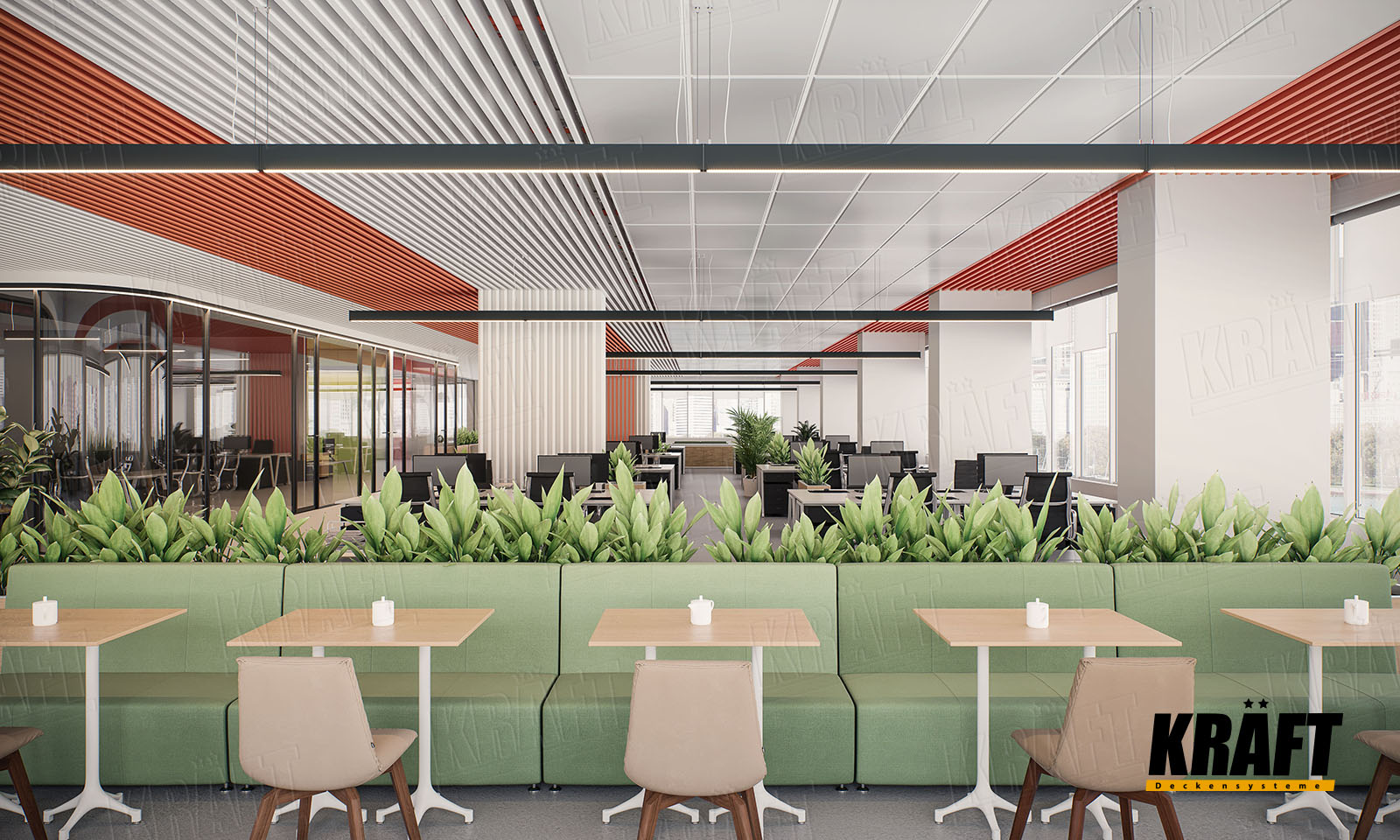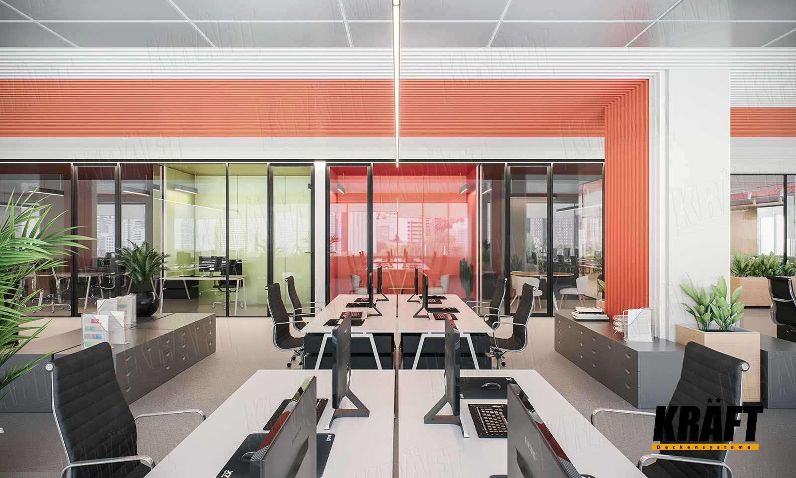Special attention should be paid to the role of the suspended ceiling in creating such an environment. Color accents should be used with care and moderation. Since the ceiling remains out of direct view during work, the intensity of exposure to the color red is minimal until the employee raises his or her head. This creates a balance between stimulating effect and comfort.