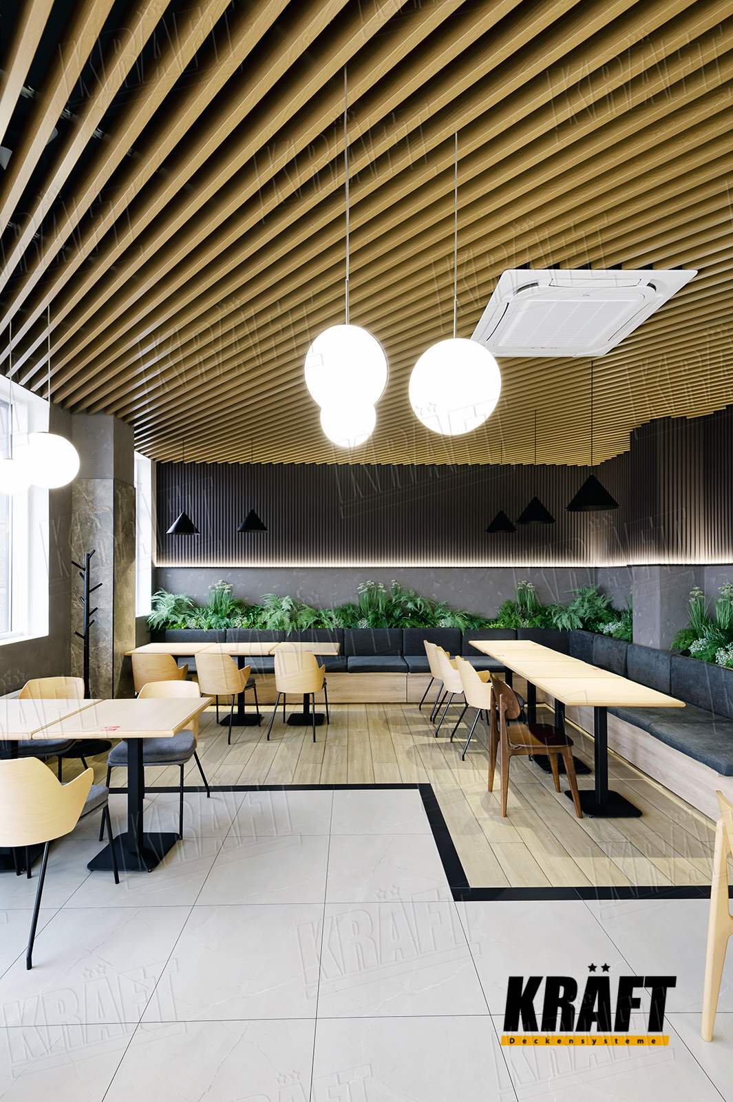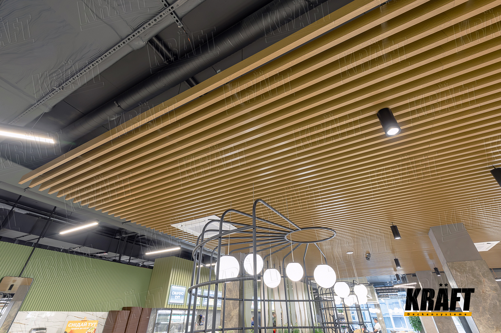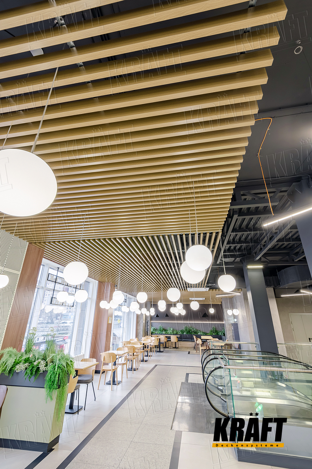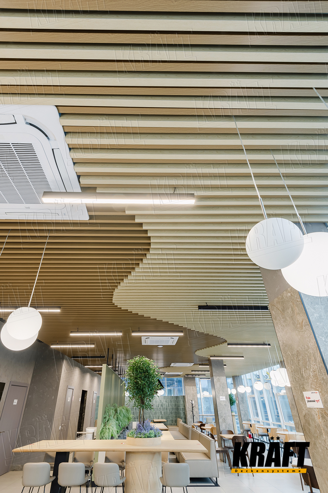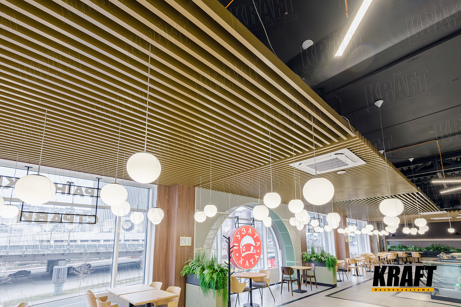 The interior of this restaurant combines stylish and practical solutions, and the key role in the design is played by a suspended ceiling made of KRAFT cube-shaped rail with wood texture. It harmonizes with the general style of the establishment, adding originality and comfort to the space.