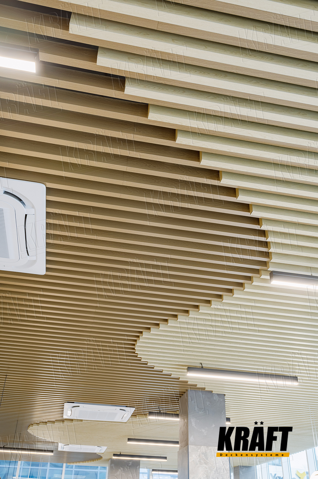 Suspended ceiling made of KRAFT cube-shaped lath became a key element of the interior of the restaurant, emphasizing its modern style and cozy atmosphere. Natural materials and carefully thought-out design not only visually decorate the space, but also fulfill important practical functions. Thanks to the combination of different textures, dynamic lines and competent lighting, the ceiling does not just serve as a background, but becomes a full-fledged part of the design concept. This approach proves that even functional elements can be stylish and create a unique atmosphere.