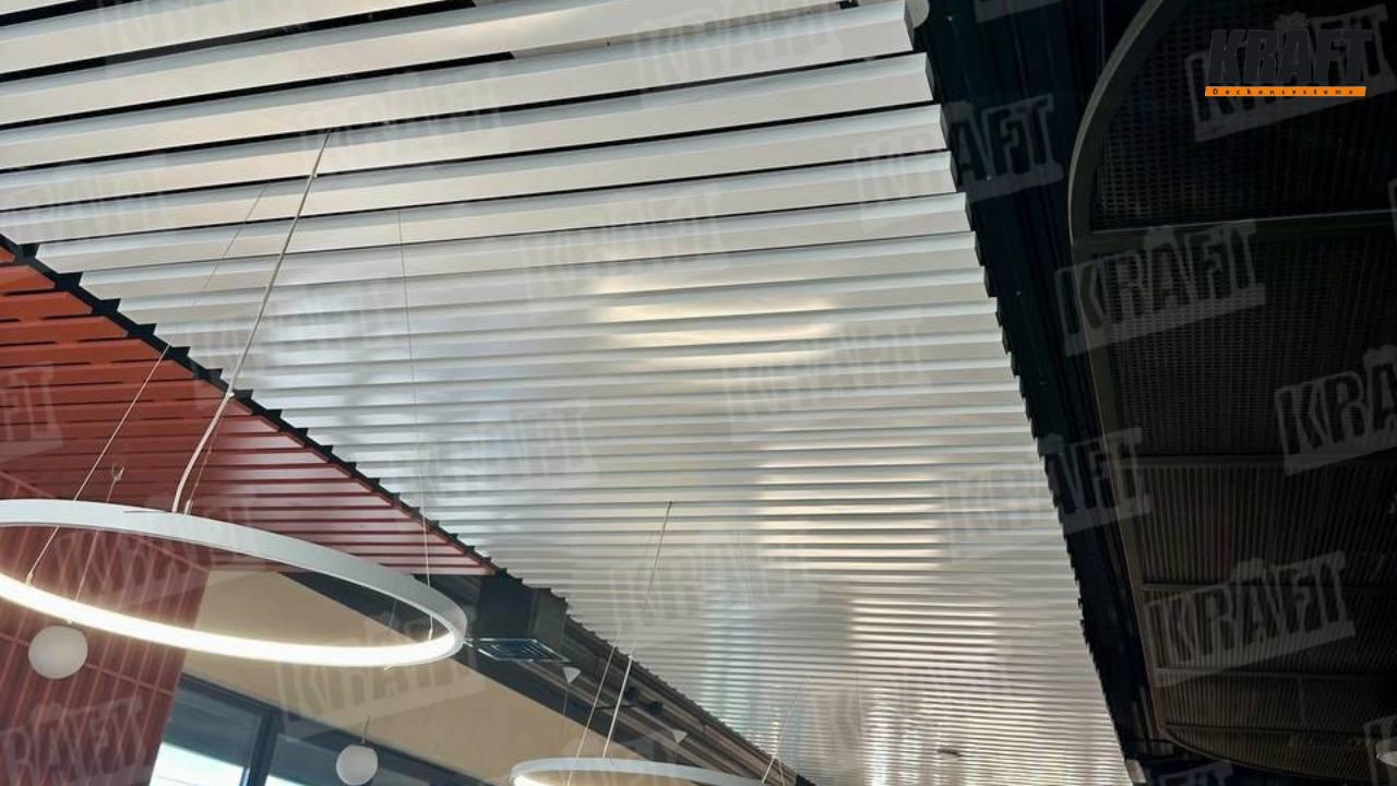 Metal slats in various colors and customizable formats open up endless design possibilities. As light interacts with the ceiling’s geometry, it creates soft, diffused illumination — enhancing a cozy or energetic atmosphere depending on the concept.