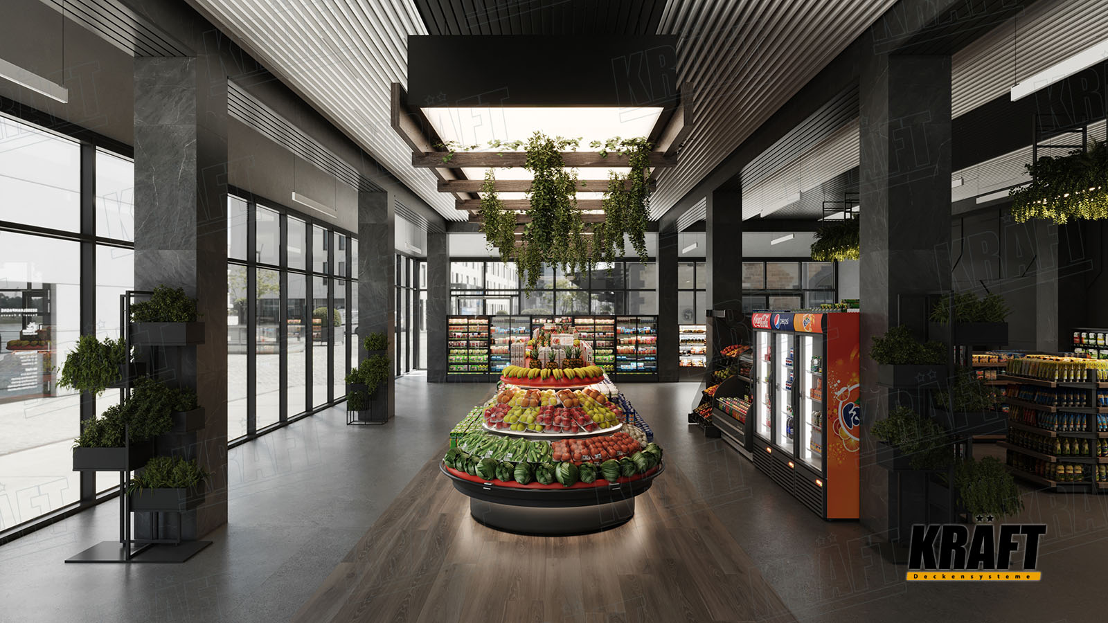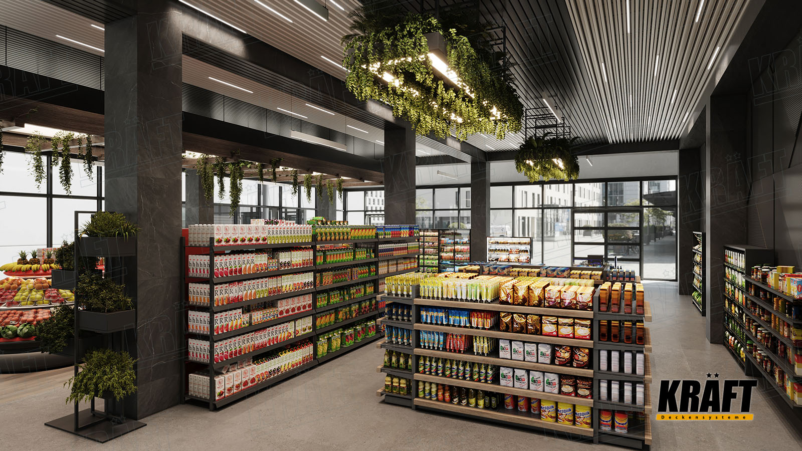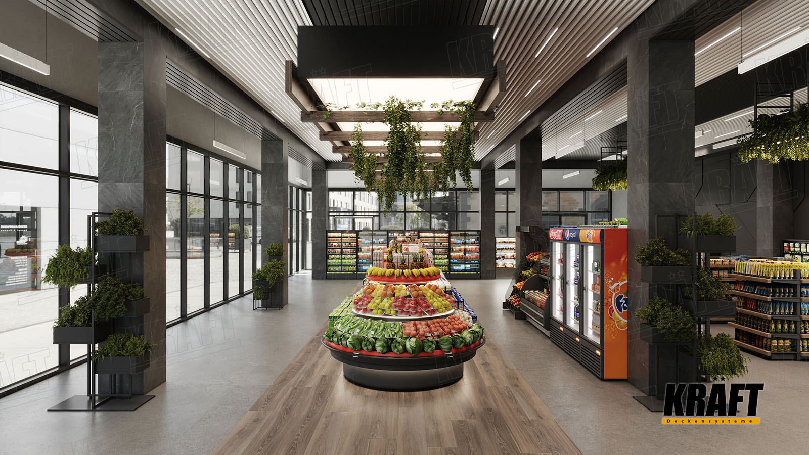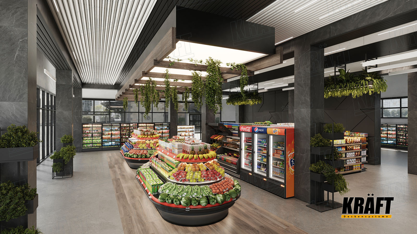 Modern interiors play a key role in attracting and retaining customers. People prefer stores where they feel comfortable and pleasant to be in. An aesthetically pleasing and neat interior creates an atmosphere of trust and security, which is especially important for customers. In a highly competitive environment, especially among smaller stores, an attractive interior can be an important competitive advantage. While the floor and walls should provide easy navigation and movement, the ceiling design can be experimented with to add unique elements and create a memorable atmosphere.