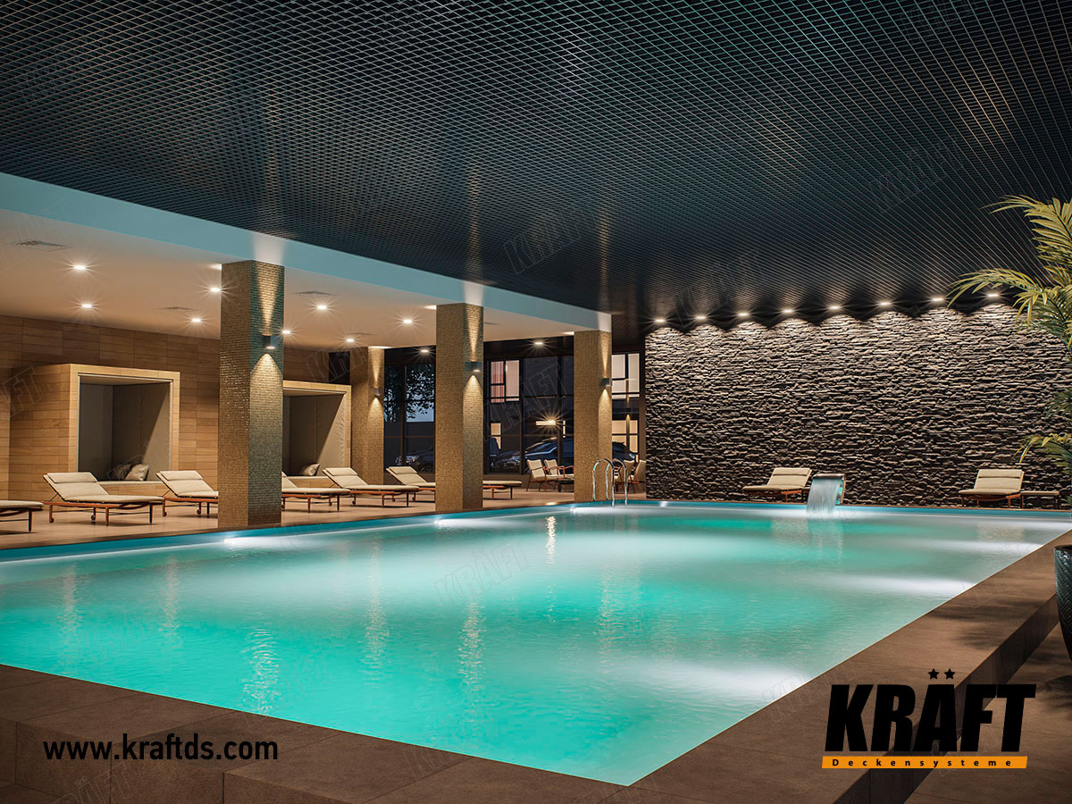 The pool area in this interior occupies a fairly large area. And in this case, preference was given to the open cell suspended ceiling grilyato GLK. This is a cassette system in which the grilyato lattice is placed on the supporting structure of the KRAFT Fortis T-profiles. The undoubted advantage is the quick installation of the suspended ceiling and easy access to communications in the ceiling space. An important factor is fire safety - the grilyato does not burn, and the supporting structure of the T-profile has fire compensators. Due to its cellular structure, grilyato does not interfere with the operation of the ventilation system, although visually it looks like a solid array.