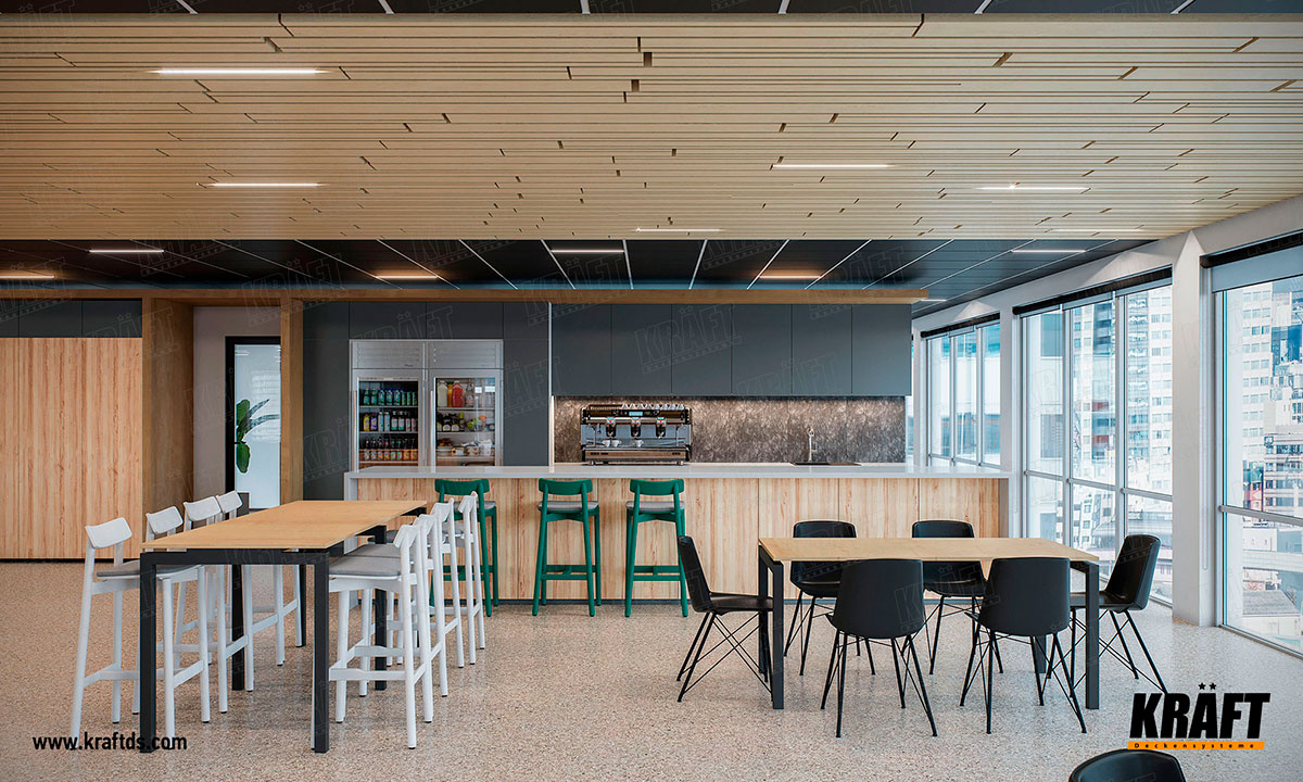 If the suspended ceiling made of metal cassettes creates a working atmosphere, then the linear strip ceiling is in demand in the recreation and eating areas. The light colors and non-linear structure of the ceiling have a calming effect, switching the brain activity of employees from work issues to communication and relaxation. As a result, a change in environment has a positive effect on the working capacity of office personnel.