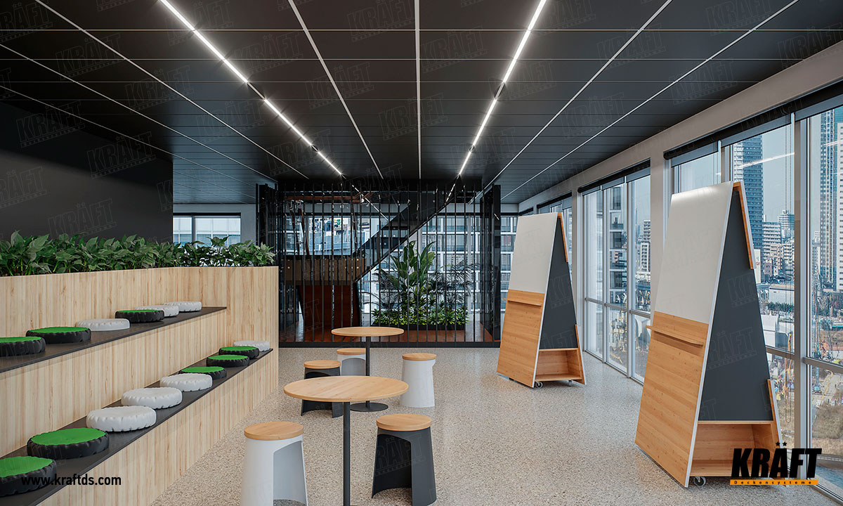 In the photo you can see that basically the suspended ceiling in the office work areas is made using the KRAFT Fortis T-profile carrier system and the black KRAFT metal cassettes installed on it. Such a color scheme gives the room a formality, seriousness and sets it up for business. The T-profile, in contrast to the tiles, is painted in silver color RAL 9006. Thanks to this contrast, the room gains depth and perspective. The same effect is created by the KRAFT T-Led 24 mm lighting system. At a great distance, the lights look like laser rays in a space game - glowing "charges" going into black infinity.