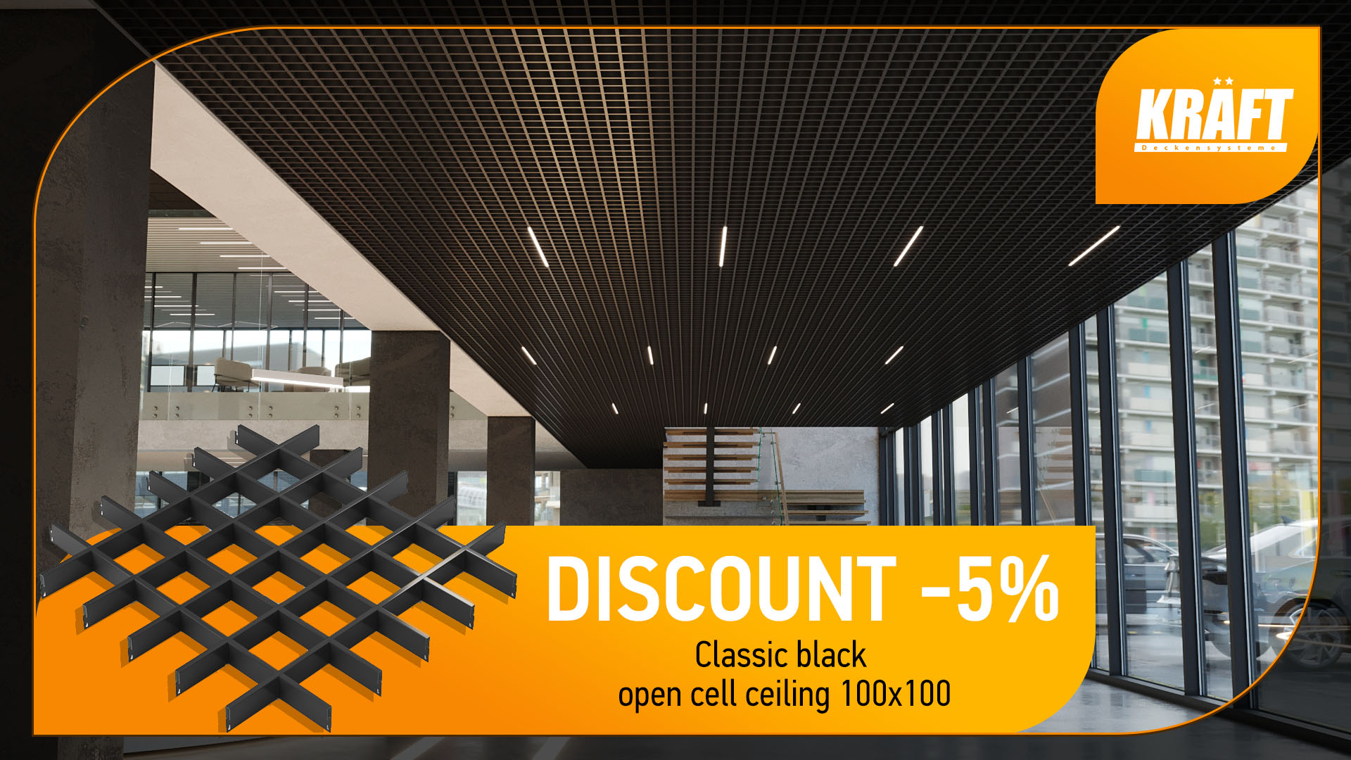Cube-Shaped Rail Suspended Ceiling KRAFT in Modern Interiors: Design That Works for Comfort and Trust