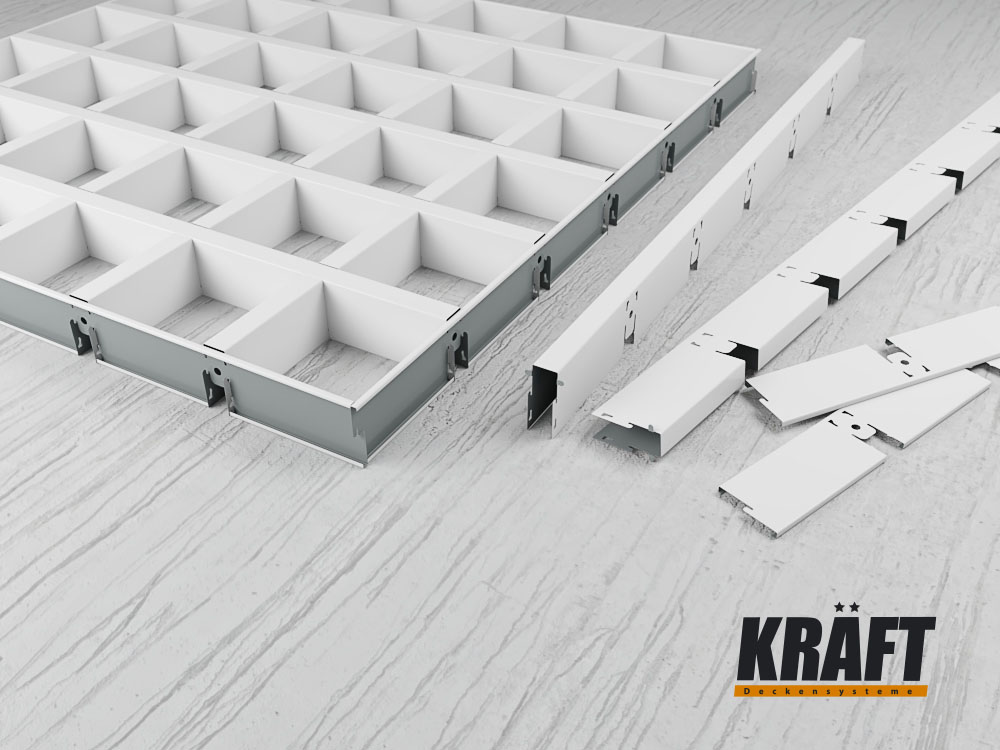 Cube-Shaped Rail Suspended Ceiling KRAFT in Modern Interiors: Design That Works for Comfort and Trust